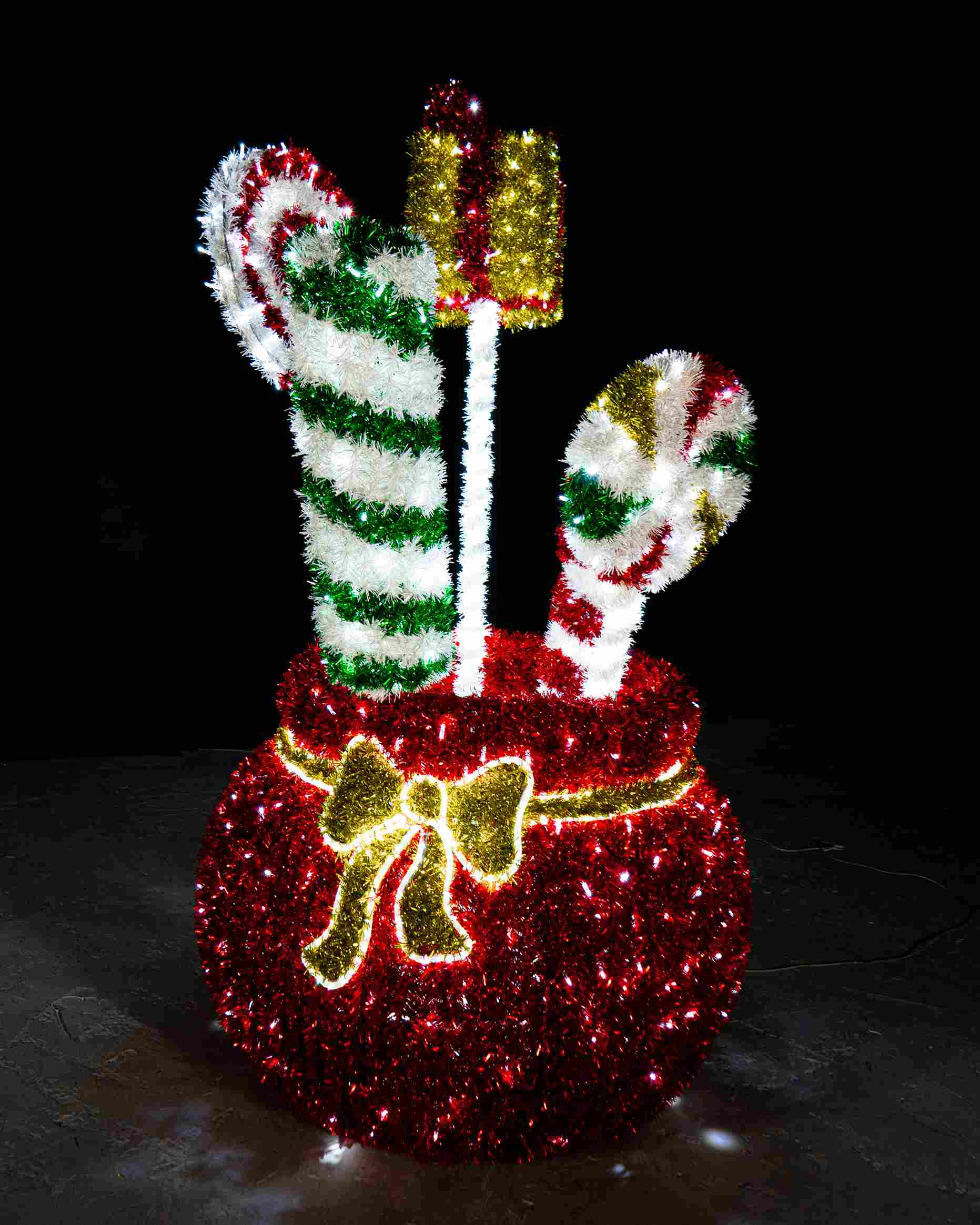 Объёмная световая фигура из мишуры «Сказочный мешок» станет ярким акцентом новогоднего украшения улиц, парков, торговых центров и площадей. Благодаря высоте 2,8 м и холодному свечению композиция хорошо заметна издалека, создаёт атмосферу праздника и сказки. Устойчивая металлическая конструкция, IP65, срок службы до 50 000 часов, подходит для круглосуточной эксплуатации на улице.