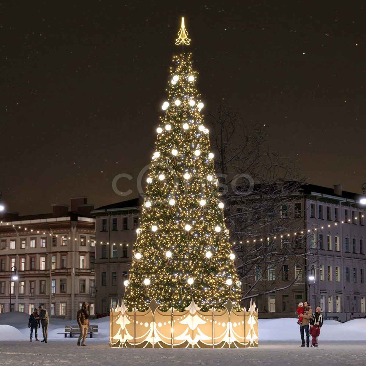 Новогодняя ёлка «Гелиос» с двумя режимами подсветки — это премиальная инсталляция для украшения центральных площадей, ТРЦ и корпоративных территорий. Высота модели варьируется от 13 до 28 метров, что позволяет использовать её в городах любого масштаба — от районных площадей до главных новогодних локаций. Ель «Гелиос» становится центром внимания и символом зимнего торжества, объединяя жителей и гостей города вокруг праздника.