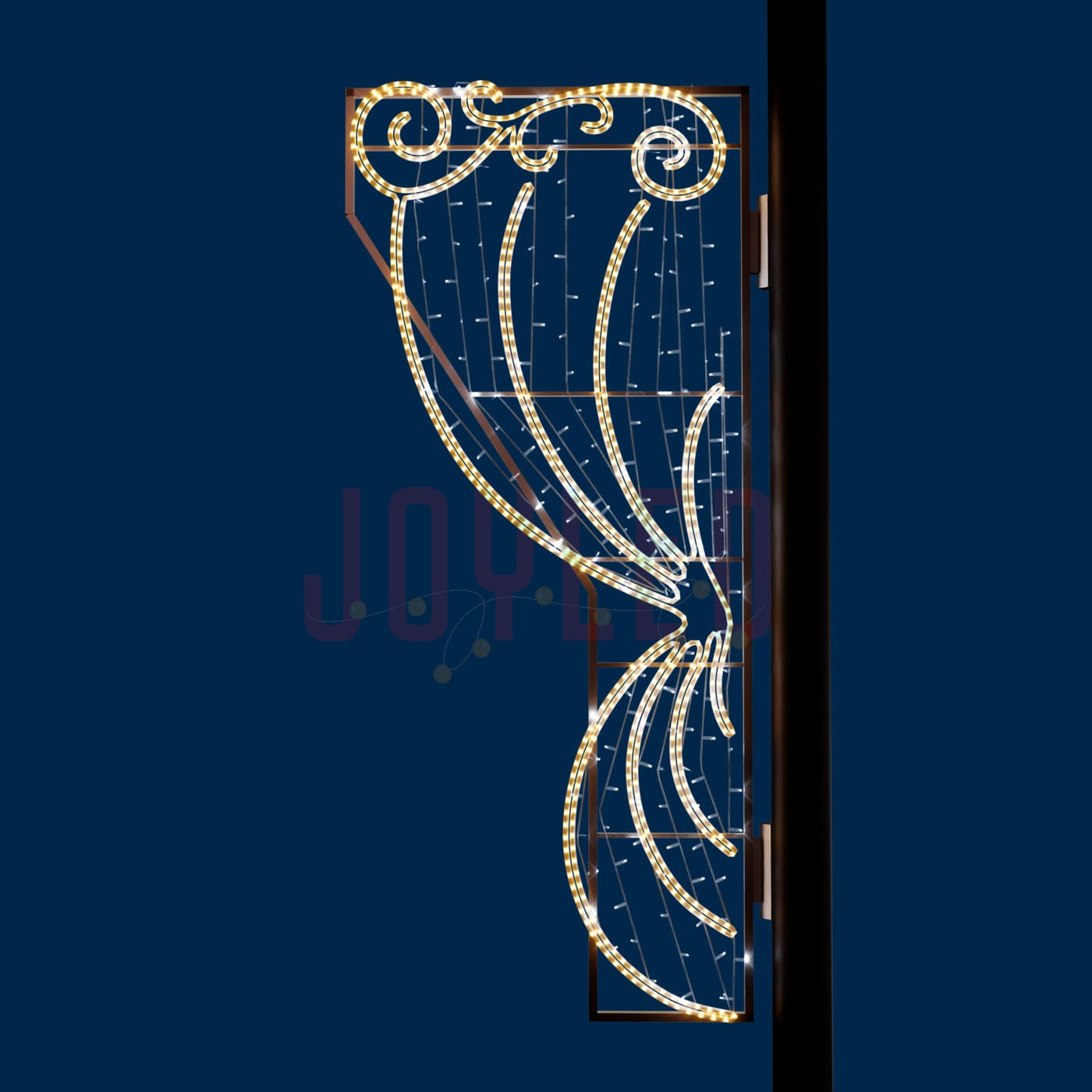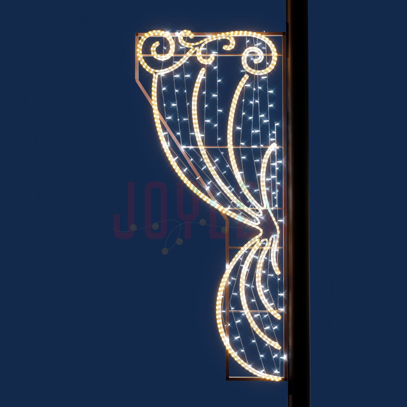 Световая консоль «Театральный занавес» — эффектное уличное украшение для опор освещения и фасадов. Размер 1×2,4 м. Выполнена из алюминия с порошковой покраской. Золотое свечение, защита IP65. Надёжная конструкция и монтаж под ключ от JOYLED. Подходит для новогоднего оформления городских и коммерческих пространств.