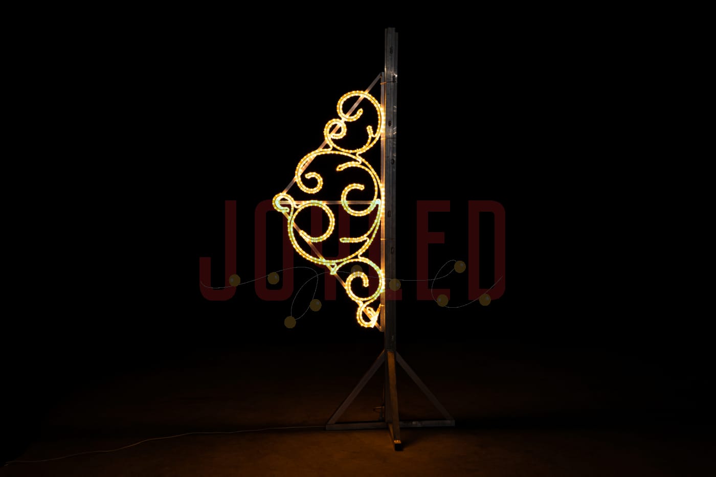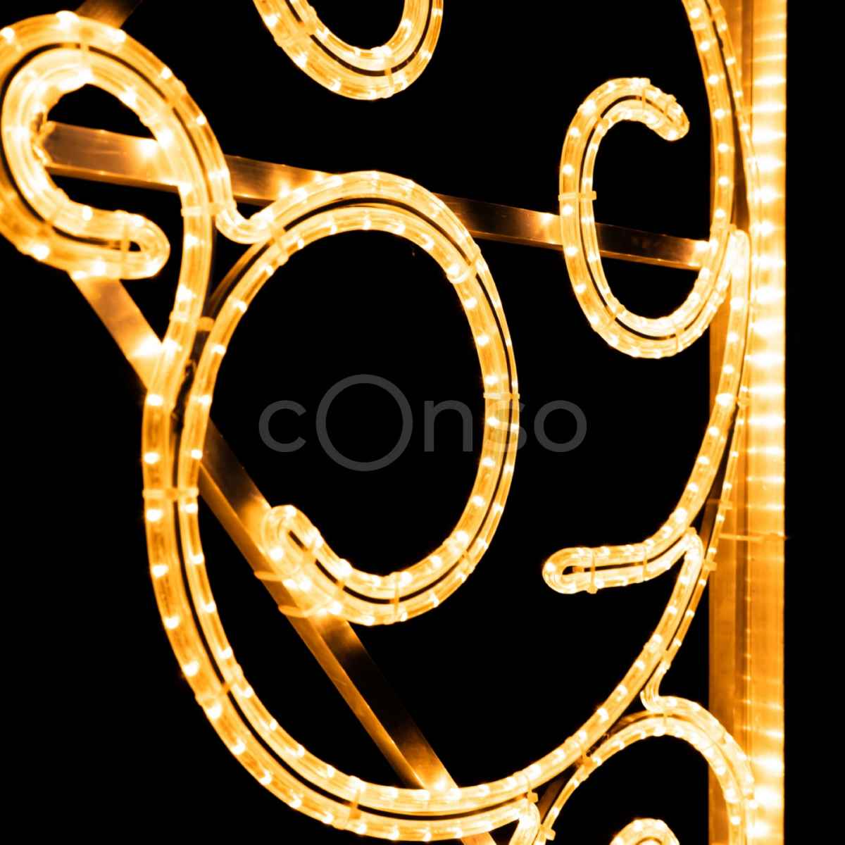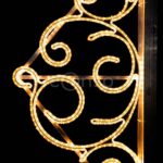 Уличная световая консоль «Золотые узоры» — декоративная фигура для оформления опор освещения в новогодний сезон. Размер 0,68×1,65 м, прочный алюминиевый каркас, защита IP65 и тёплый золотой свет. Используется для украшения ТЦ, улиц, парков, бизнес-центров. Работает от сети, подключение в комплекте.
