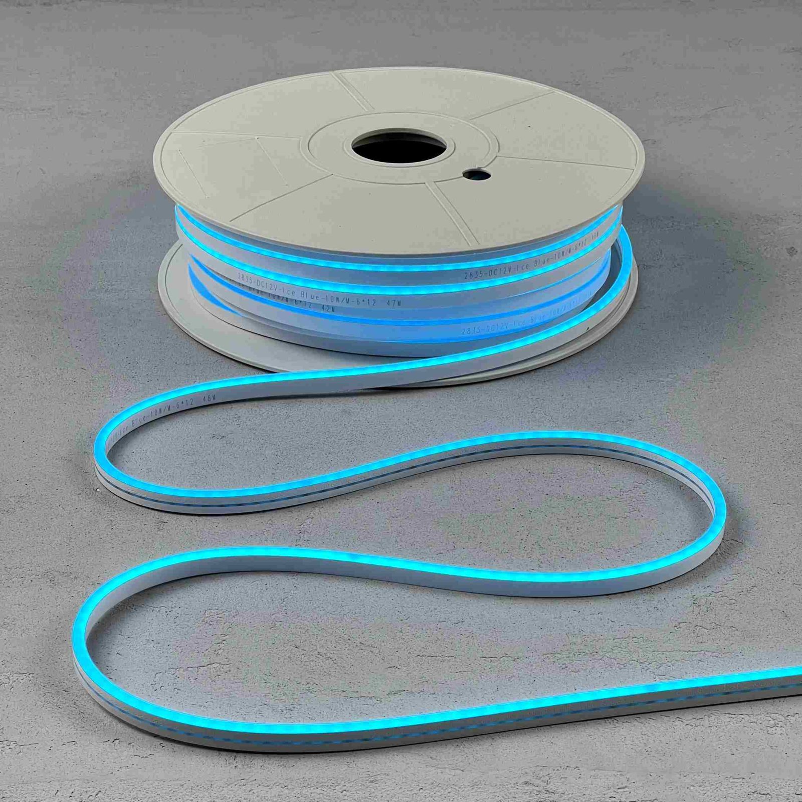 Лента оснащена светодиодами SMD 2835 (110 LED/м) и светит под углом 180°. Мягкий небесно-голубой свет распределяется по всей длине равномерно, без разрывов и пятен. При потреблении всего 10 Вт/м неон остаётся ярким и экономичным, подходит для оформления длинных контуров и уличных композиций.