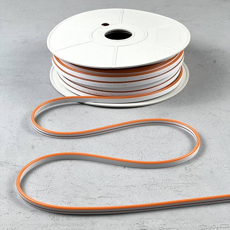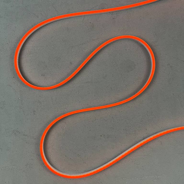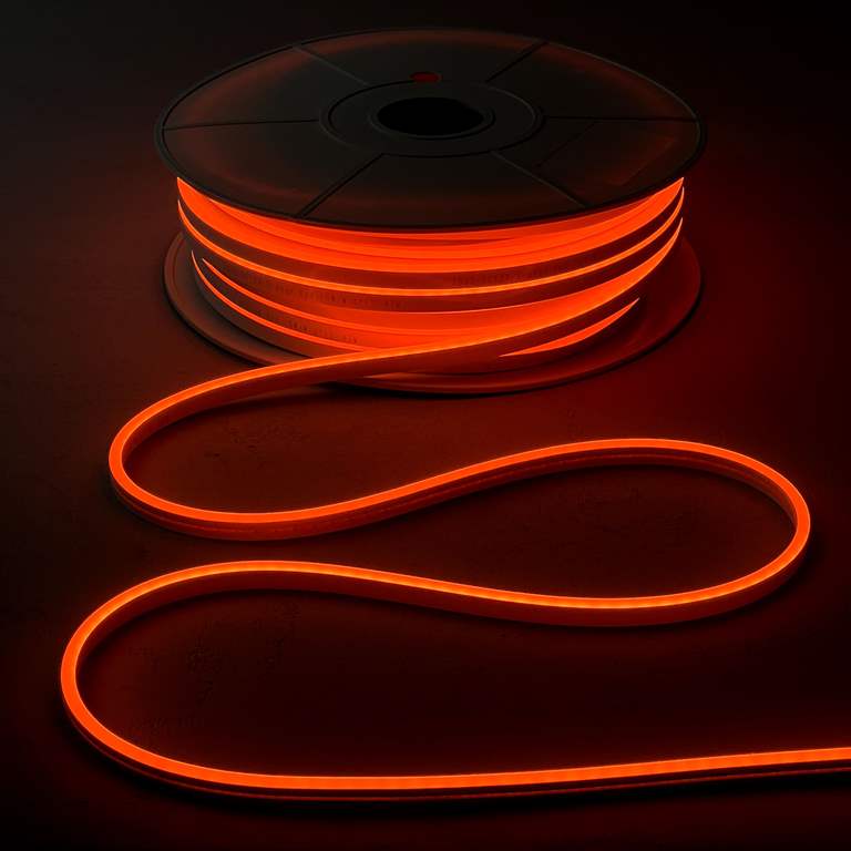 Неон оснащён светодиодами SMD 2835 (110 LED/м), угол свечения — 180°. Это обеспечивает плотное и равномерное освещение без тёмных участков и точек. При потреблении всего 10 Вт/м оранжевая лента остаётся яркой и экономичной. Цвет стабильный, не тускнеет со временем и не искажает оттенок под воздействием ультрафиолета.