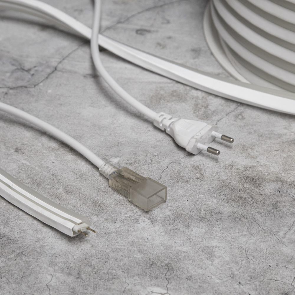 В комплекте уже есть сетевой кабель, неон готов к использованию сразу. При необходимости можно соединять несколько бухт между собой, создавая сплошную линию подсветки.