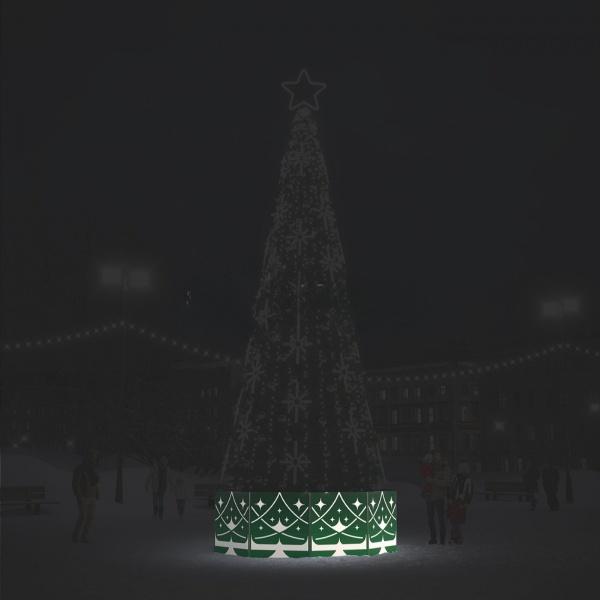 Модель разработана для городских площадей, парков и торговых центров, где важны безопасность и визуальная целостность праздничной зоны. Ограждение защищает основание ёлки и электрические соединения от случайного доступа, одновременно придавая композиции аккуратный завершённый вид.