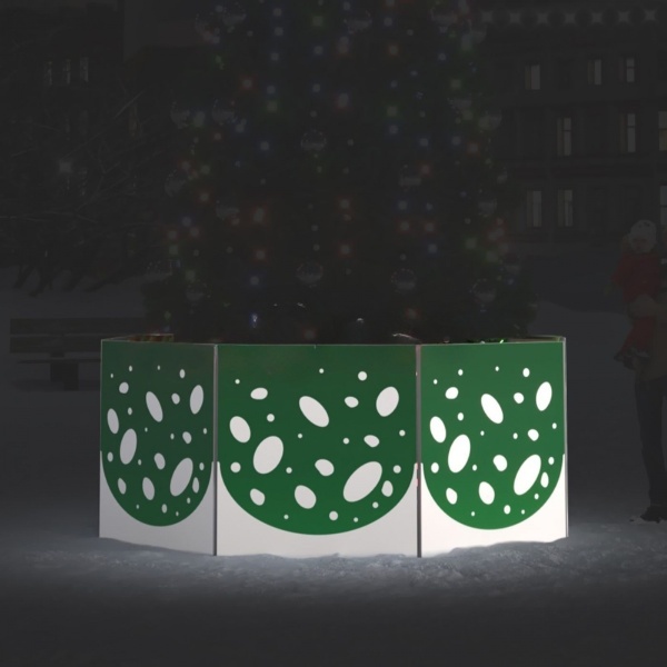 Ограждение для новогодней ёлки «Снегопад» от JOYLED — это изысканная декорация, создающая ощущение движения и лёгкости, словно вокруг ёлки кружит снежная вьюга. Оно закрывает основание инсталляции и придаёт ей завершённый вид, выполняя функцию и защиты, и украшения. Днём ограждение блестит на солнце, вечером — сияет в лучах гирлянд, дополняя праздничную атмосферу.