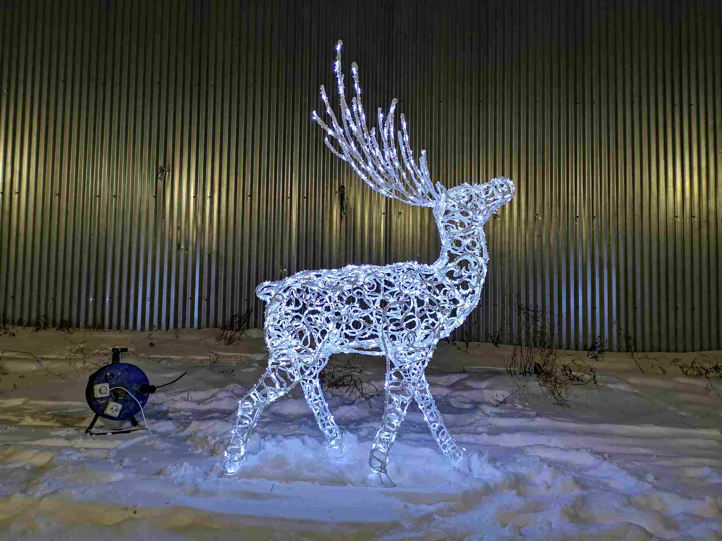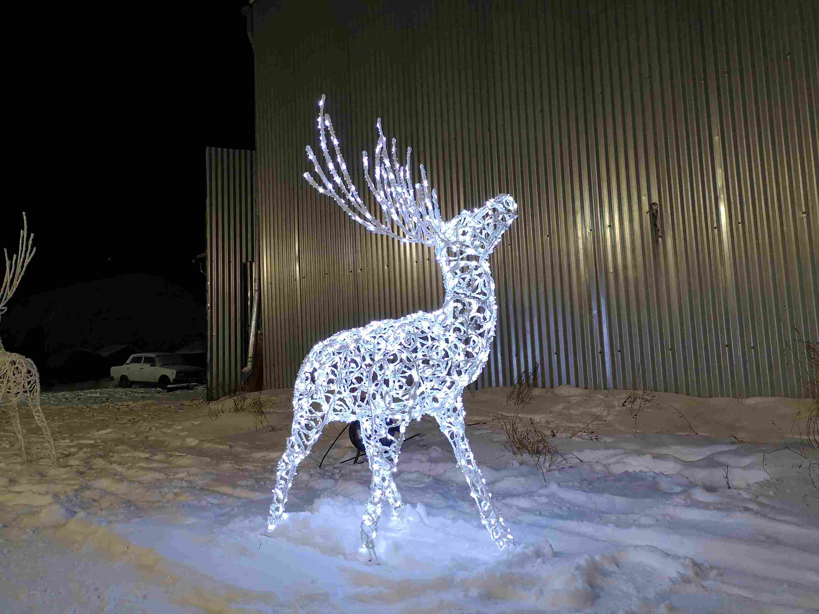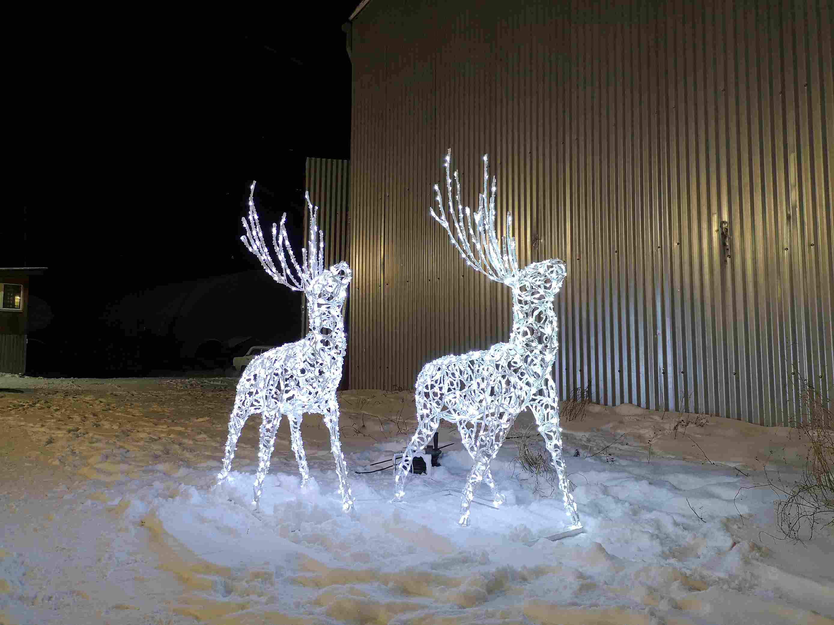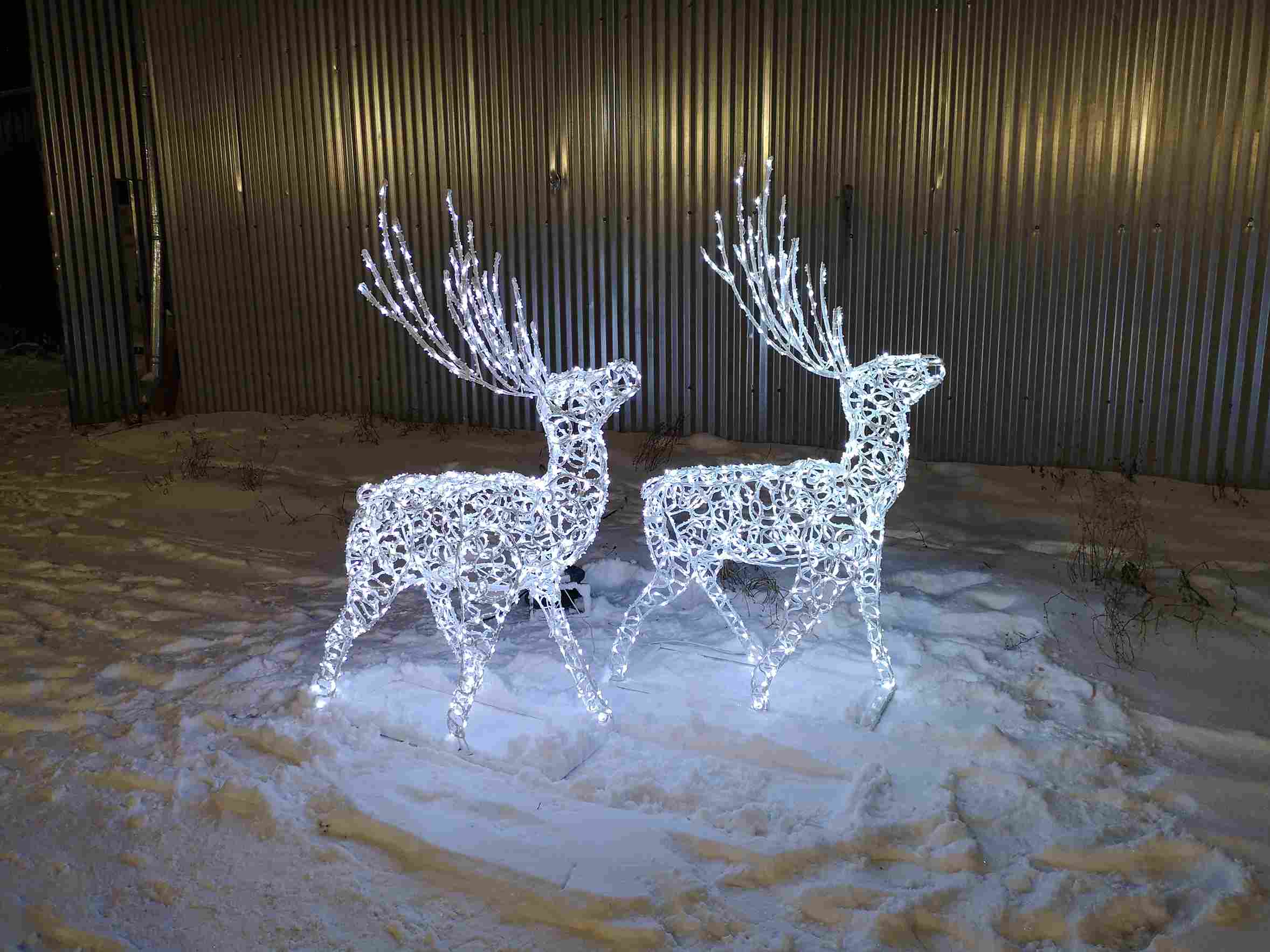 Фигура легко масштабируется в композиции — можно установить одного оленя или собрать семейство из 2–3 штук разных размеров. Особенно эффектно смотрятся фигуры с диммером или управлением через Wi‑Fi-реле — для создания динамичных сценариев включения и регулировки яркости.