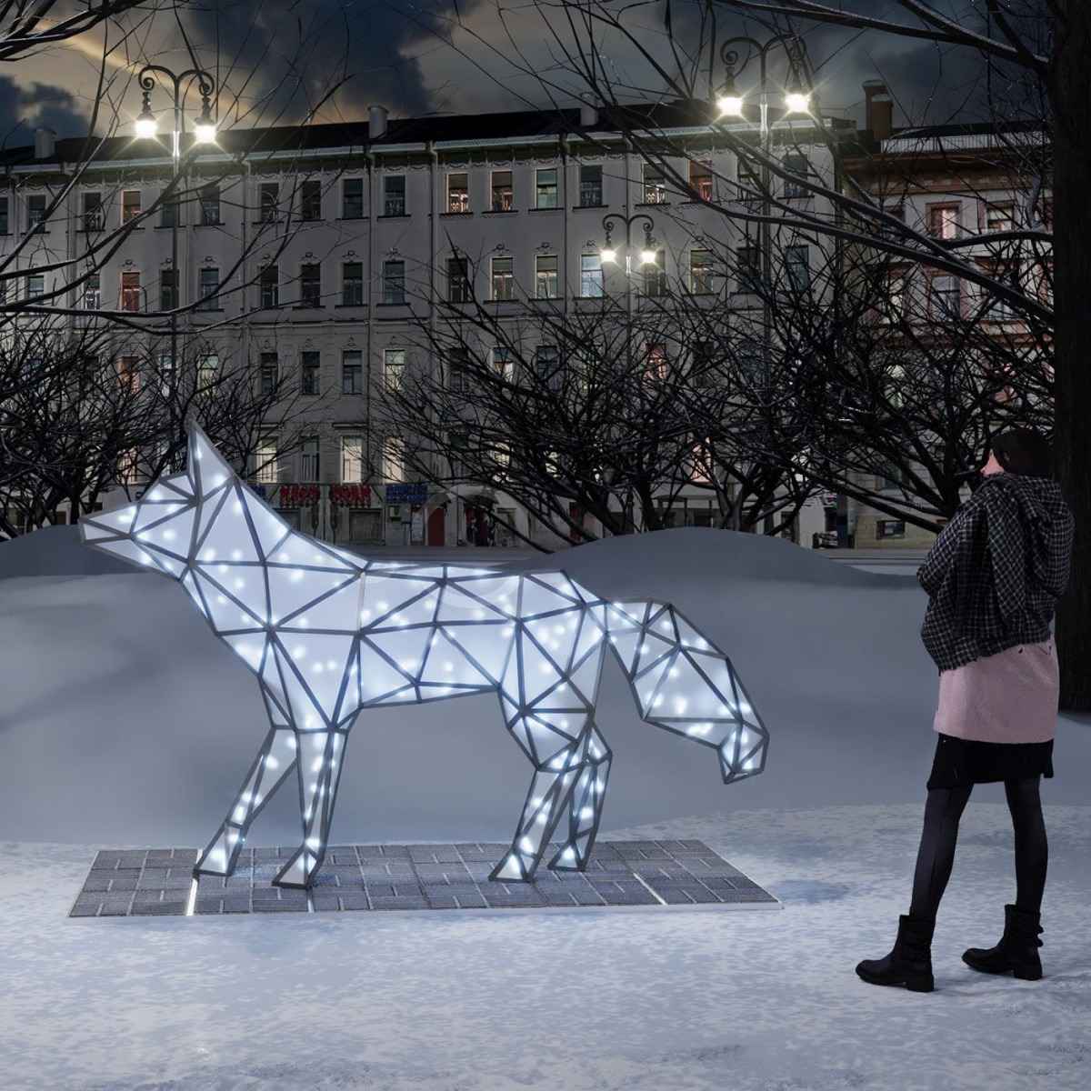 Полигональная скульптура «Серебристая лиса» — это яркий пример современного уличного декора, сочетающего геометрию, минимализм и художественную выразительность. Фигура выполнена из прочного алюминия и оснащена холодным белым свечением. Она подходит для украшения входных зон, парковых территорий, аллей, площадей, фасадов ТЦ и бизнес-центров, входных групп на городских мероприятиях и в зонах отдыха.