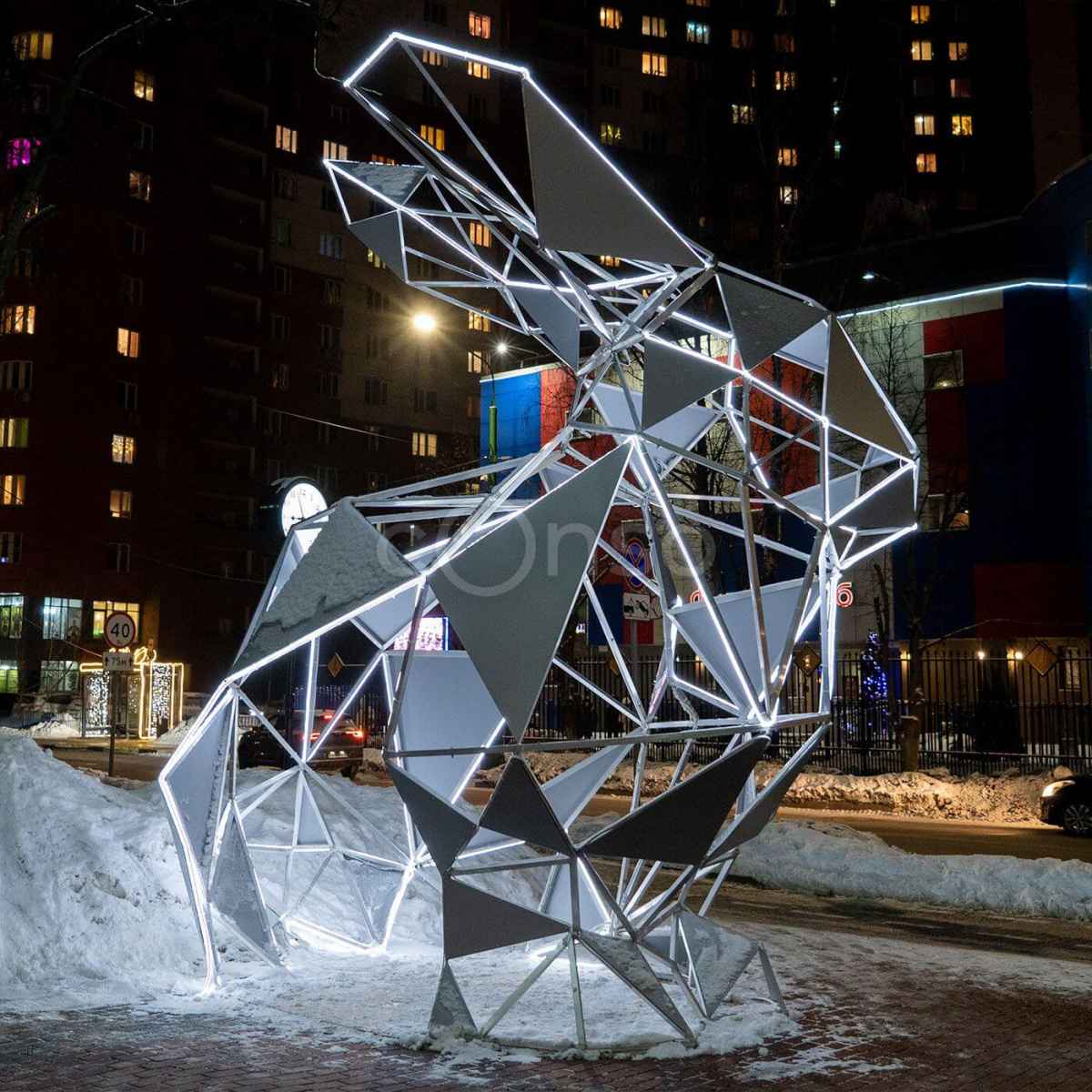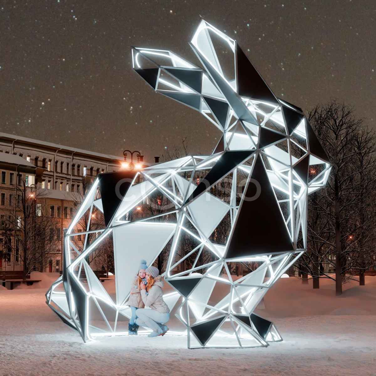 Световая фигура «Серебристый кролик» — это сочетание геометрии, эстетики и атмосферы. Благодаря полигональному дизайну, грани фигуры создают игру света и тени, особенно при внешней подсветке. Серебристое свечение подчёркивает форму и создаёт ощущение лёгкости и движения. Большие габариты (4,92×4,62×3,70 м) позволяют кролику стать центром внимания на площадях, скверах, у ТЦ и фасадов бизнес‑центров.