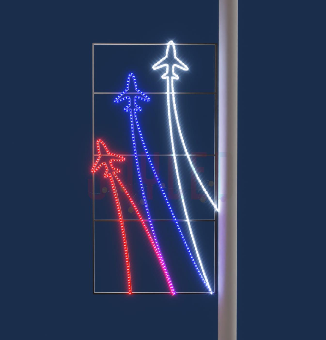 Праздничная консоль «Самолёты» — уличная световая фигура на опору освещения. Размер 1×2 м, цвет свечения — синий, красный и холодный. Алюминиевый каркас с защитой IP65 выдерживает мороз до –50 °C. Используется в оформлении ко Дню Победы, Дню города, на улицах и фасадах. Монтаж и доставка по Москве и МО.
