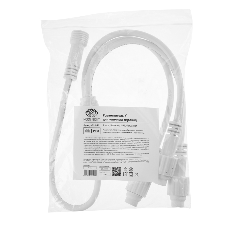 Разветвитель-Y с 1 входом и 3 выходами — удобный способ подключить несколько уличных гирлянд от одного источника питания. Белый ПВХ-провод помогает скрыть проводку на светлых фасадах, колоннах или декоративных конструкциях. Аксессуар подходит для профессионального оформления домов, деревьев, входных групп и сезонных подсветок JOYLED.