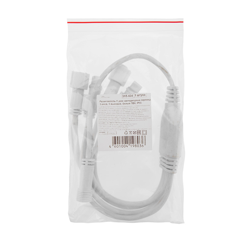 Разветвитель-Y (шнур) для уличных гирлянд, 1 вход — 5 выходов, провод белый ПВХ