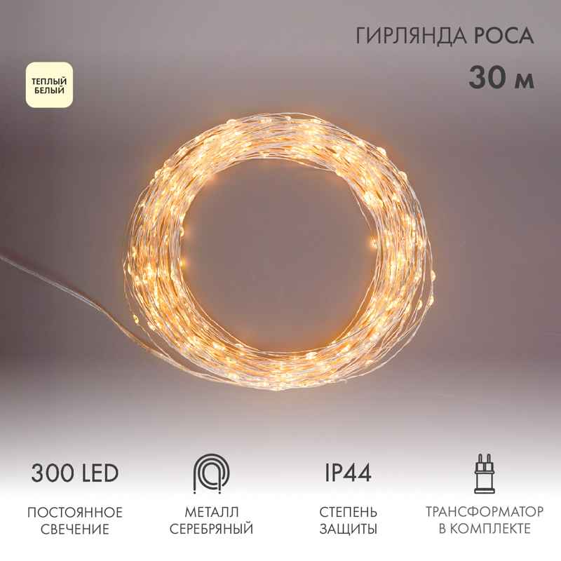 Тонкая гирлянда Роса длиной 30 метров с тёплым белым свечением и 300 LED — для создания уюта на улице. Постоянный режим, IP44, питание от сети. Металлический серебристый провод почти не виден на светлом фоне. Идеально для деревьев, заборов, колонн.