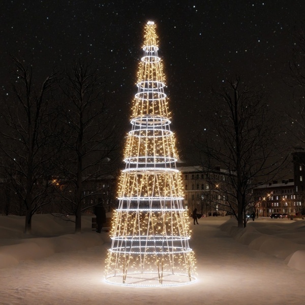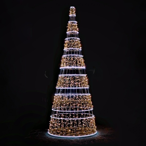 Световая ёлка‑конус высотой 5 метров — компактное, но выразительное решение для оформления улиц, торговых центров и общественных пространств. Конструкция из алюминия устойчива к зимним условиям, а тёплый свет создаёт праздничную атмосферу. Подходит для городской среды и частных территорий. Монтаж под ключ от JOYLED.