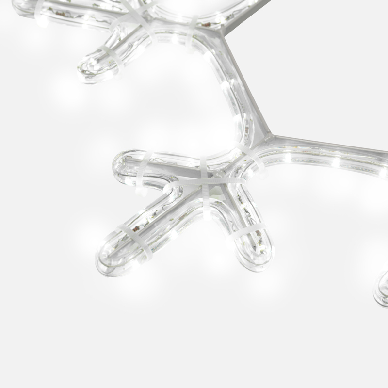 Фигура выполнена на прочной металлической основе, на которую равномерно закреплён световой дюралайт. Это долговечный гибкий шнур с интегрированными светодиодами и надёжной защитой от внешней среды. Степень защиты IP65 означает, что снежинка не боится пыли, влаги, дождя и снега. Она сохраняет работоспособность даже в дождливую погоду или при обильных осадках.