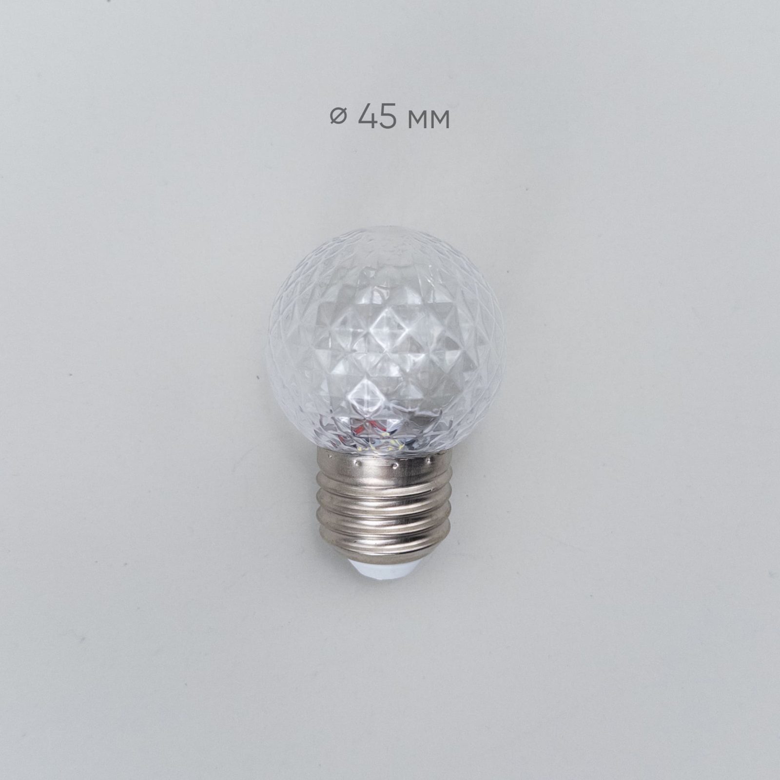 Лампа работает в автоматическом режиме Flash: встроенный контроллер обеспечивает случайное мерцание без дополнительных настроек. Три светодиода в корпусе Ø45 мм дают мягкие, но заметные вспышки, распределённые по всей длине гирлянды. Это решение позволяет создавать динамичные инсталляции без сложных систем управления и подключений. Достаточно вкрутить лампу в патрон E27 — и она начинает работать сразу после включения.