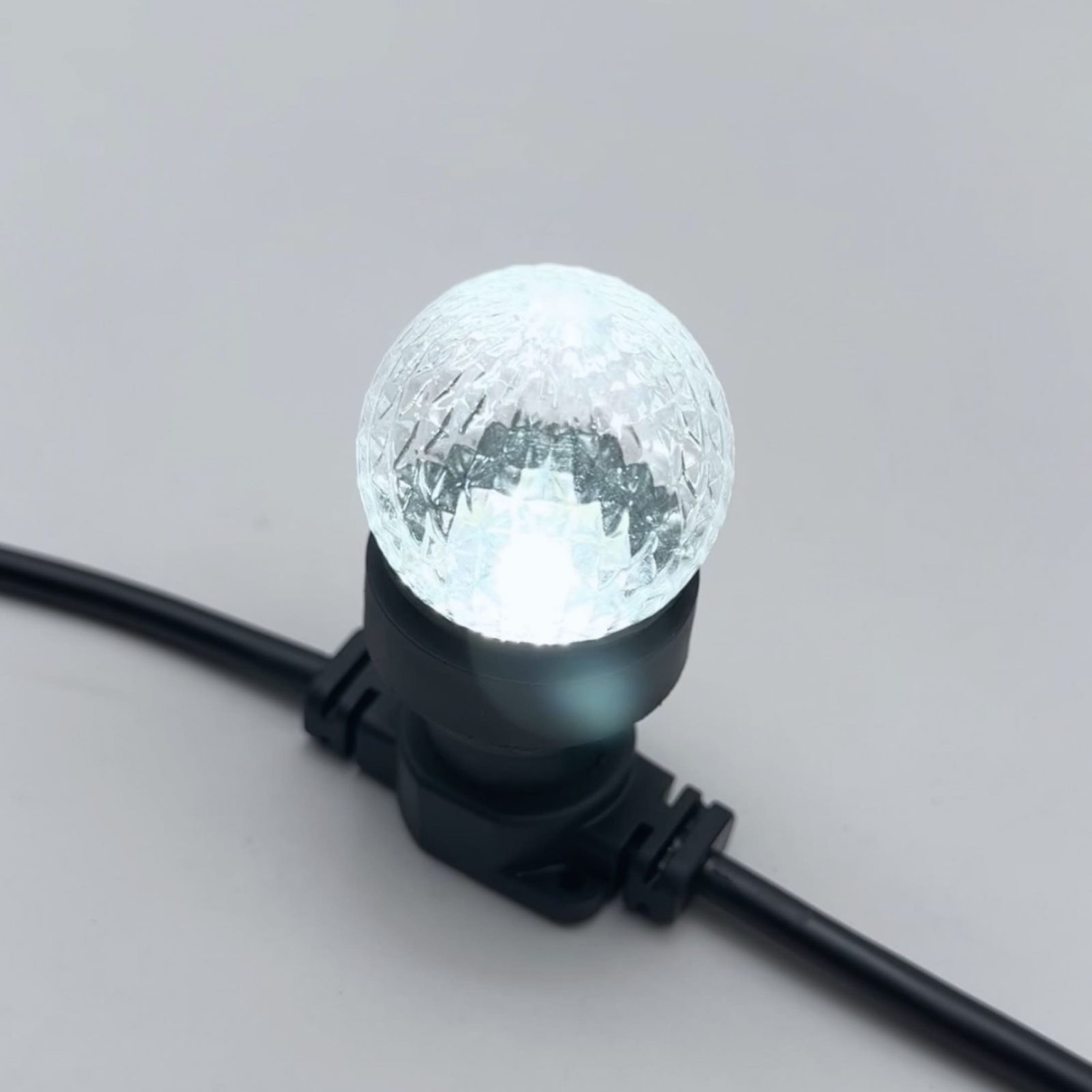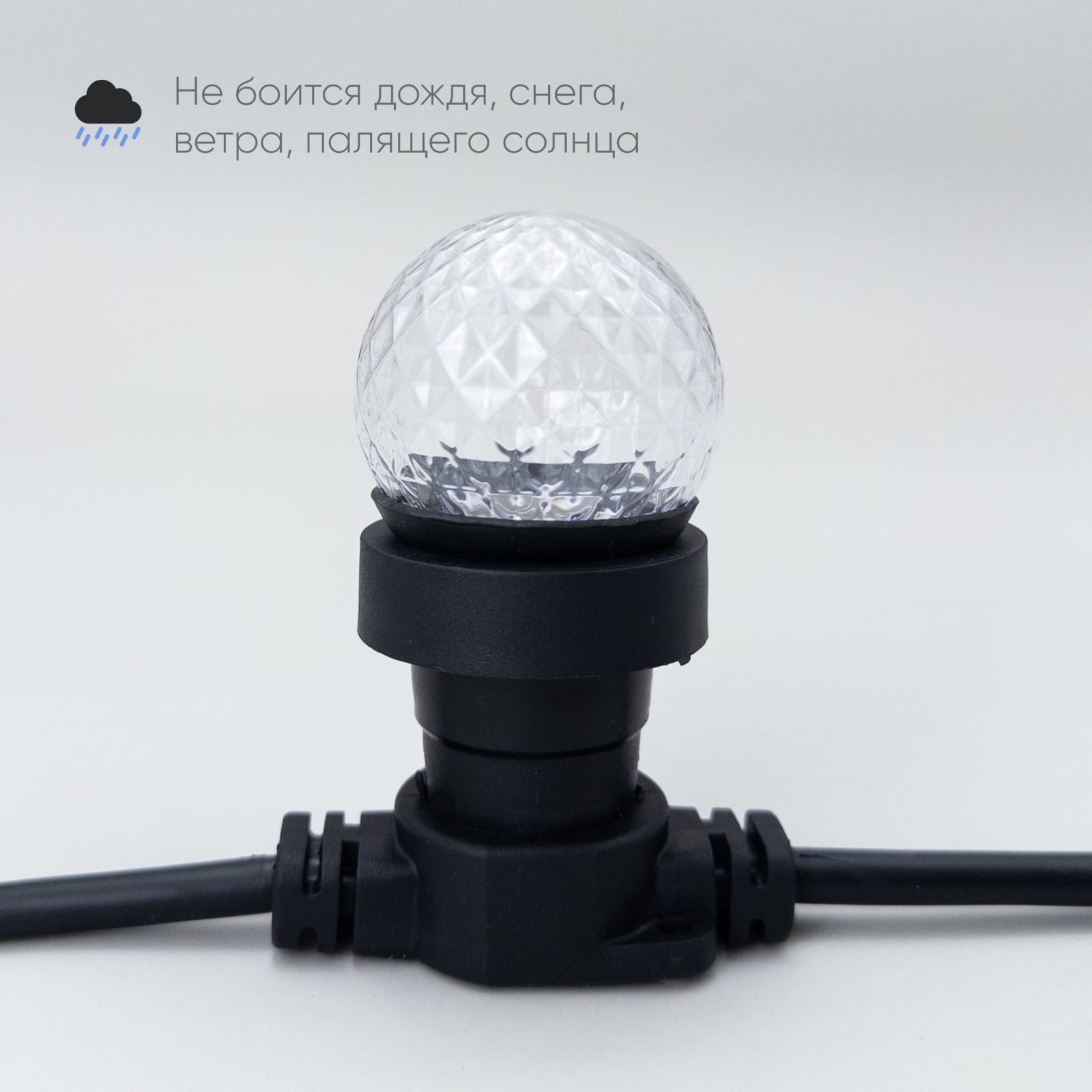 Корпус из прозрачного ударопрочного пластика и металлический цоколь E27 гарантируют устойчивость к влаге, пыли и механическим воздействиям. Класс защиты IP65 и рабочий диапазон от –50 до +40 °C позволяют эксплуатировать лампу в зимних уличных установках, на фасадах, в парках и на деревьях. Срок службы до 30 000 часов обеспечивает надёжную работу в течение нескольких сезонов без замены.