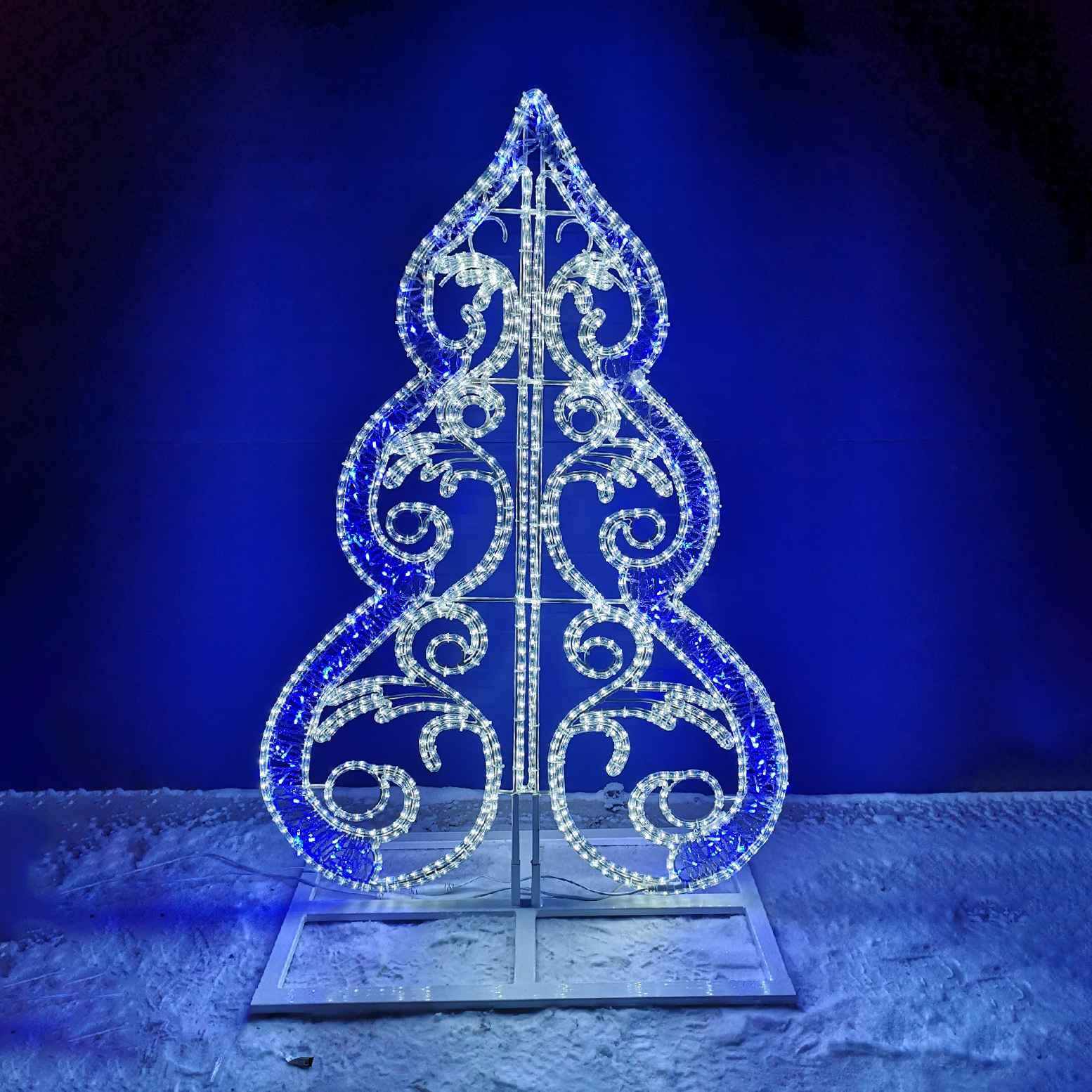 Световая фигура «Ель ажурная» — это универсальное решение для уличного или интерьерного оформления в новогодний сезон. Она выглядит одновременно сдержанно и торжественно, добавляя в пространство ощущение уюта, света и праздника. Ажурный орнамент делает эту ёлку особенно выразительной как днём, так и в вечернее время — когда загорается подсветка, появляется волшебное мерцание и декоративная глубина.