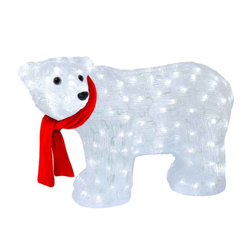 Фигура выполнена из акрила — прочного и лёгкого материала, устойчивого к механическим воздействиям и низким температурам. Каркас скрыт под акриловой поверхностью, создавая аккуратный силуэт и ровное световое пятно. Внутри встроены 200 светодиодов, равномерно распределённых по всей поверхности мишки.