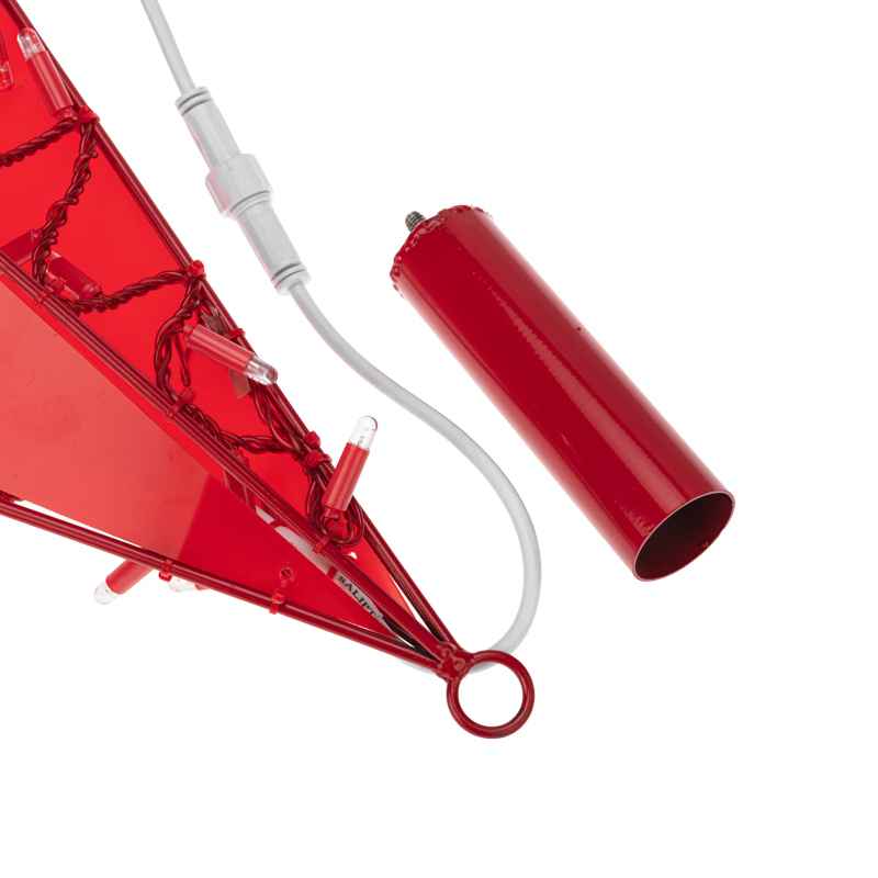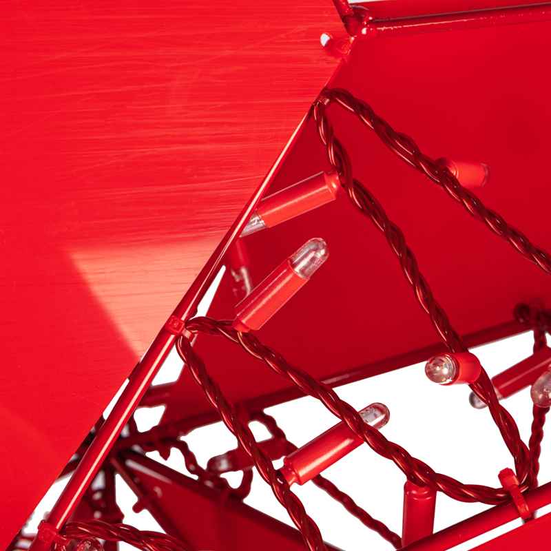 Каркас выполнен из металла с антикоррозийным покрытием, что гарантирует надёжность и устойчивость конструкции при длительном использовании на улице. Вес фигуры — всего 6,6 кг, что делает её удобной для монтажа и транспортировки. Светодиодная нить плотно и равномерно закреплена по периметру — используется 200 красных диодов, создающих насыщенное, но не слепящее свечение.