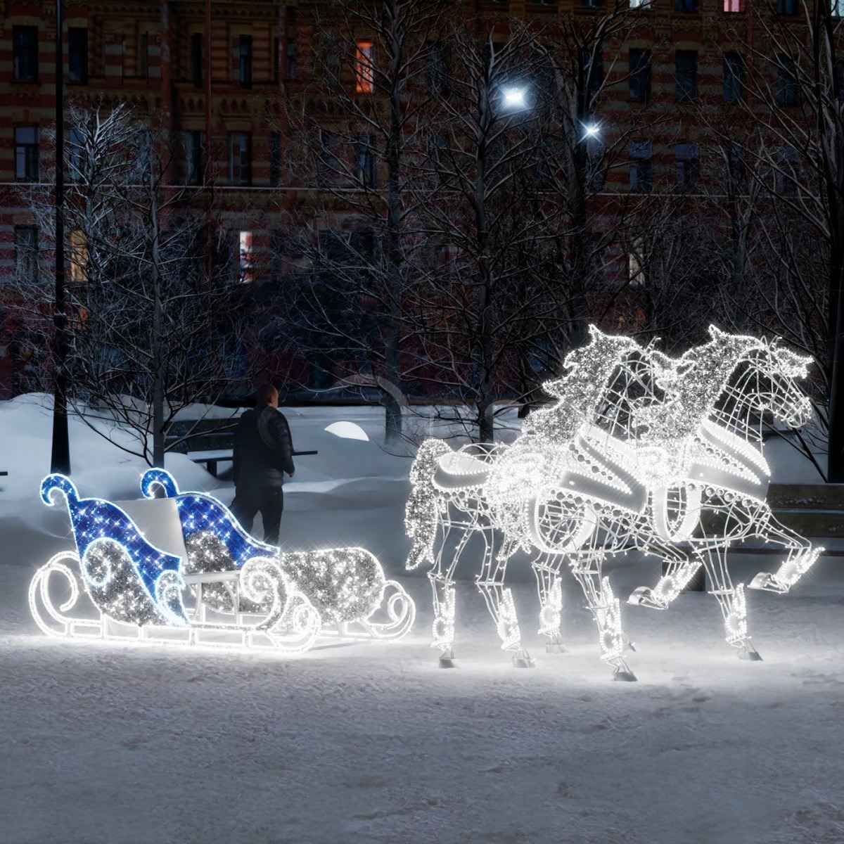 Уличная световая инсталляция из новогодних фигур пользуется большой популярностью для новогоднего оформления сквера или парка.