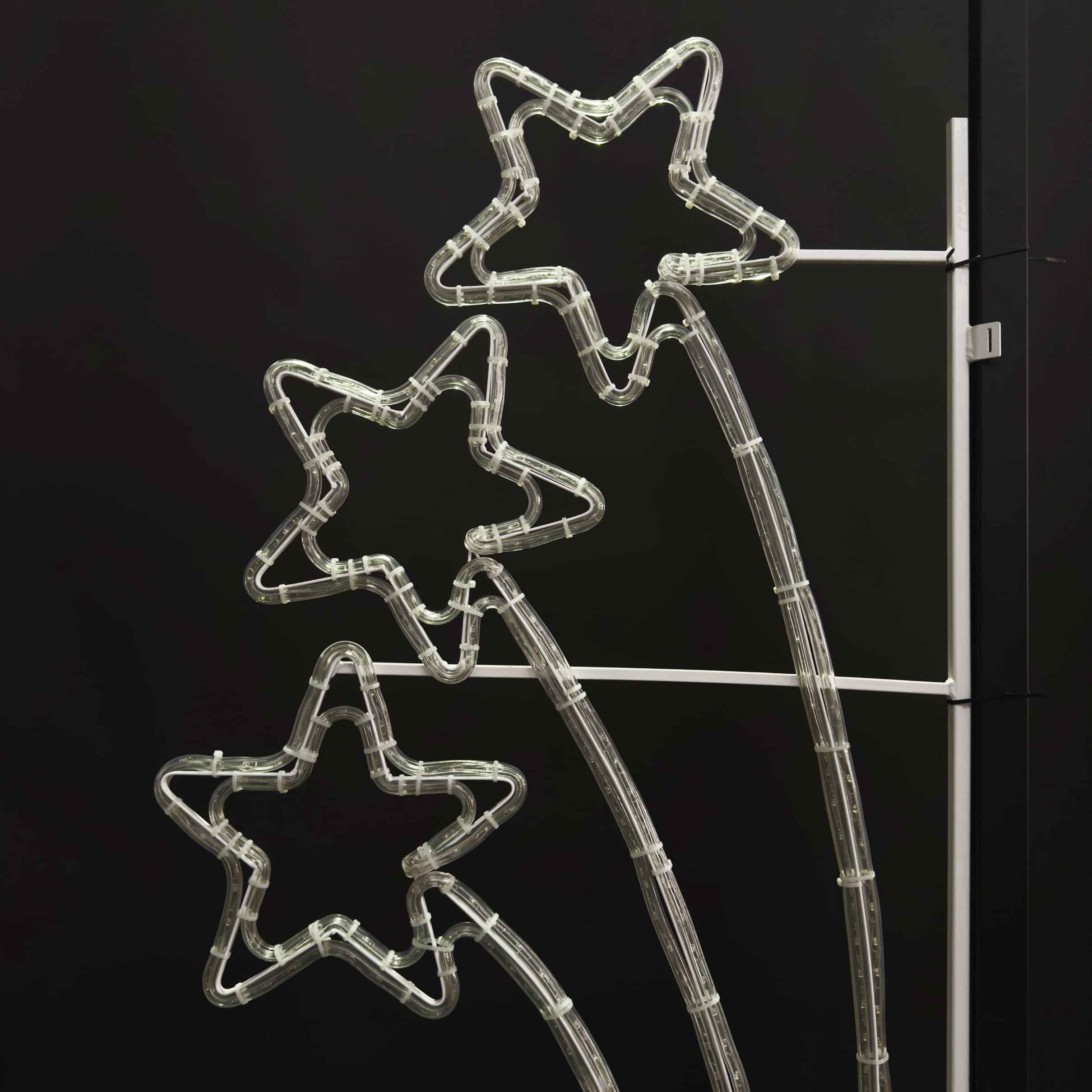 Уличная светодиодная консоль «Три кометы» — эффектная фигура для вертикального оформления фасадов, опор освещения и городских пространств. Размер 70×150 см. Каркас — из оцинкованной стали с порошковой окраской. Цвет свечения — триколор или на выбор. Подключение — от сети 220 В. Конструкция защищена по классу IP65, подходит для круглогодичного использования. Гарантия — 12 месяцев. Производство серии OPTIMA-PRO, бренд JOYLED.