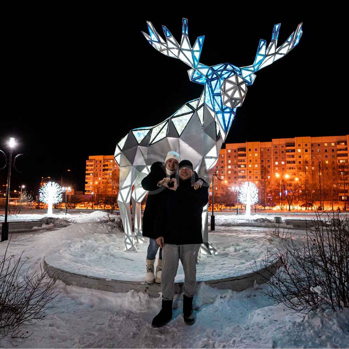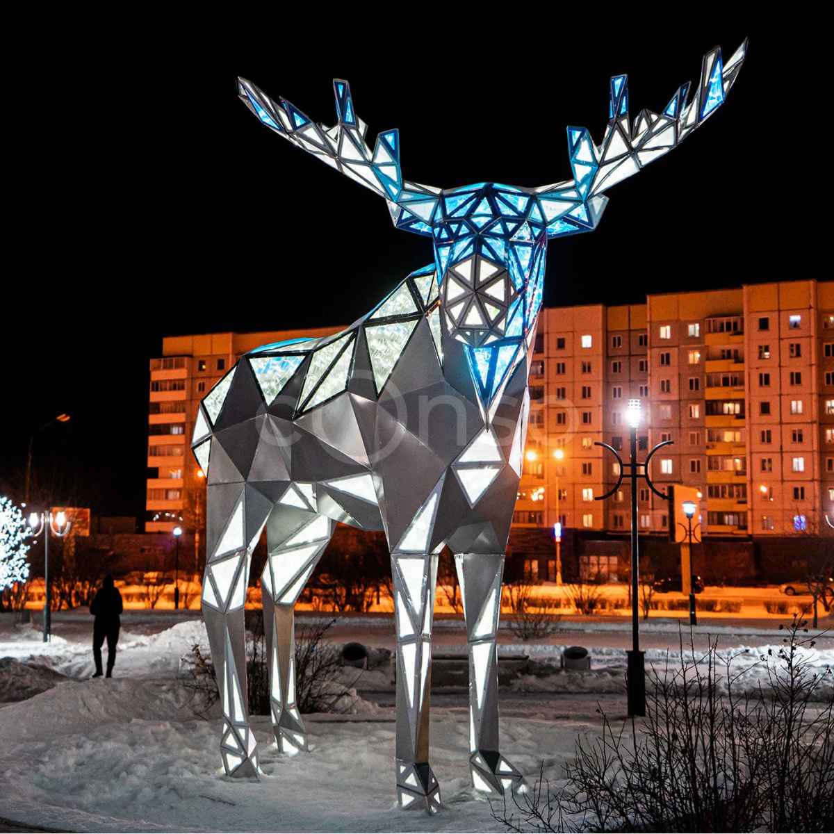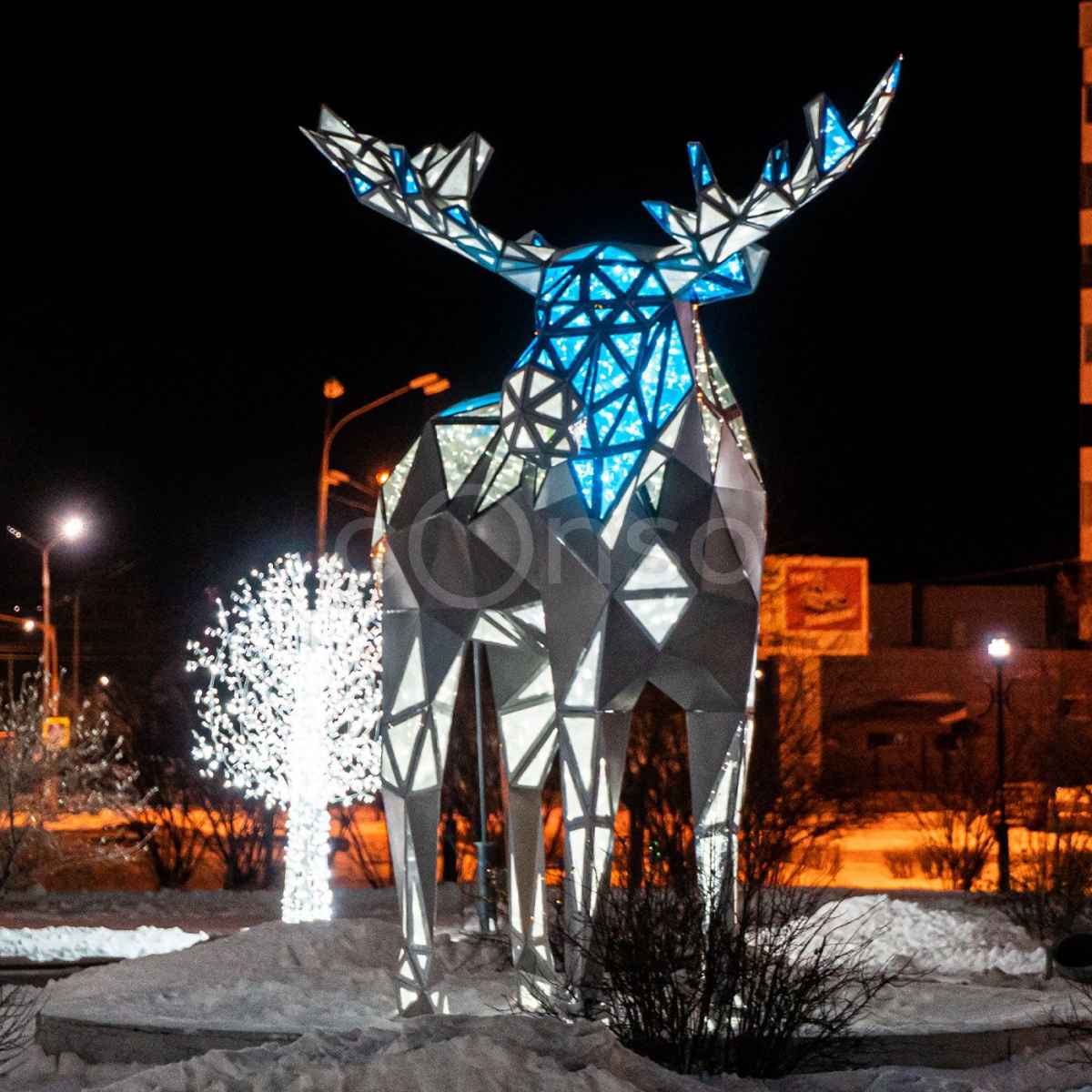 Световая полигональная фигура представляет собой оригинальное украшение для ландшафта, а также для приусадебных участков, городских парков и скверов. Конструкция изготовлена из легкого и прочного алюминиевого каркаса. Обшивка может быть выполнена из поликарбоната или композитного материала.