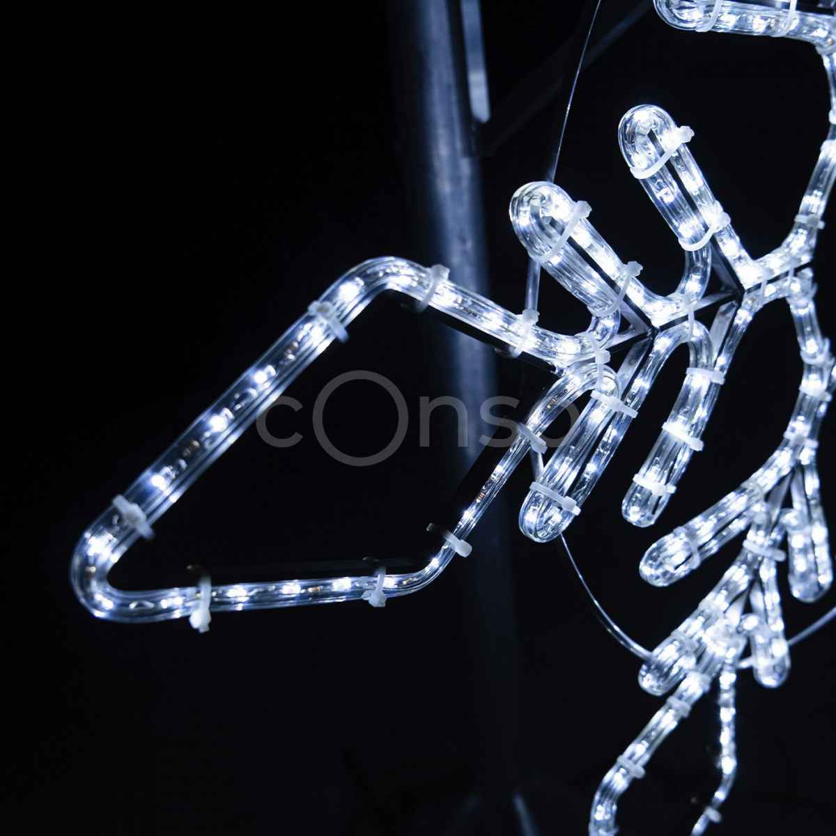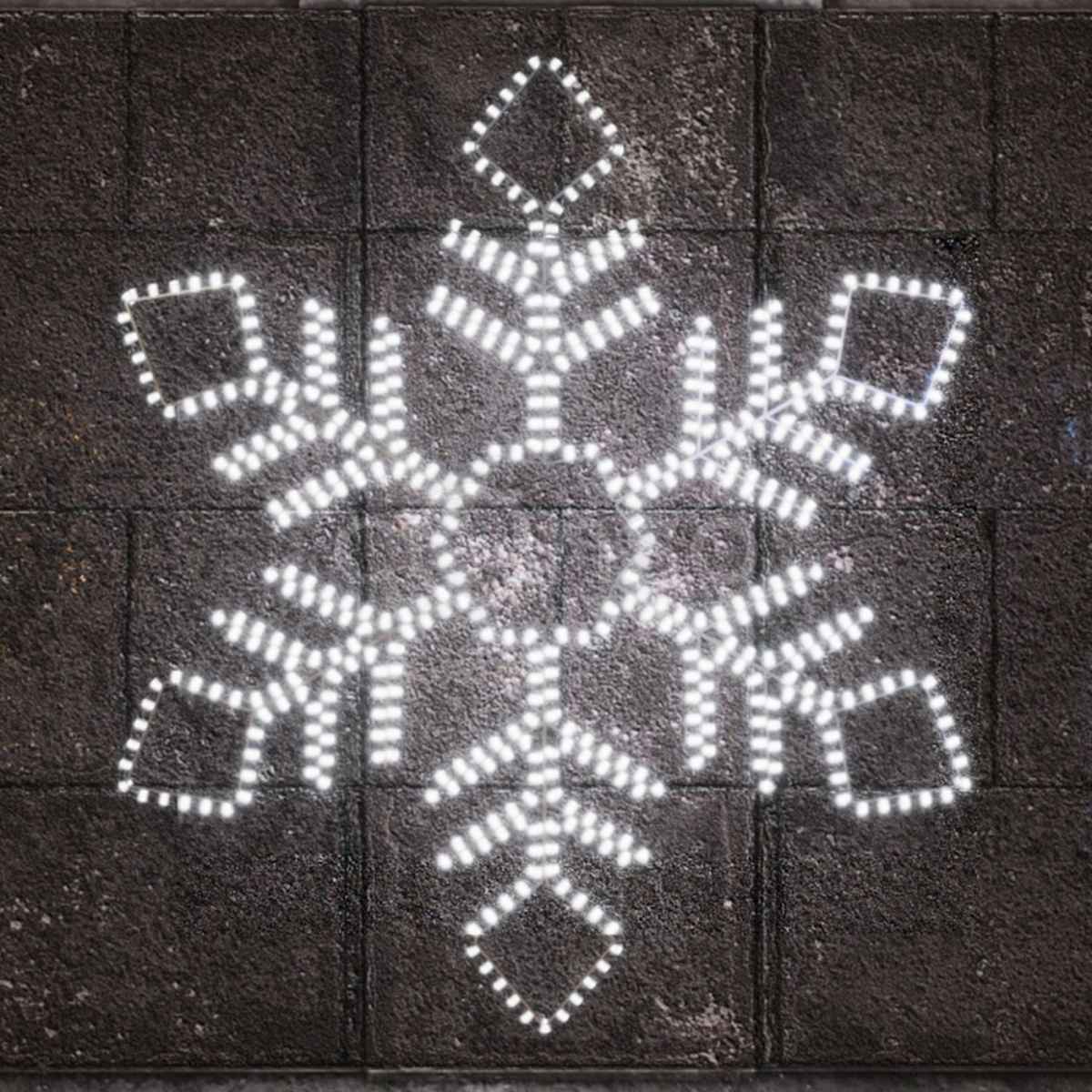 Размер световой фигуры — 1×1,1 метра. Такой формат оптимален для фасадного размещения: снежинка хорошо видна с расстояния, но не загромождает пространство. Холодный белый свет подчёркивает зимнее настроение и гармонично смотрится на фоне любого здания.
