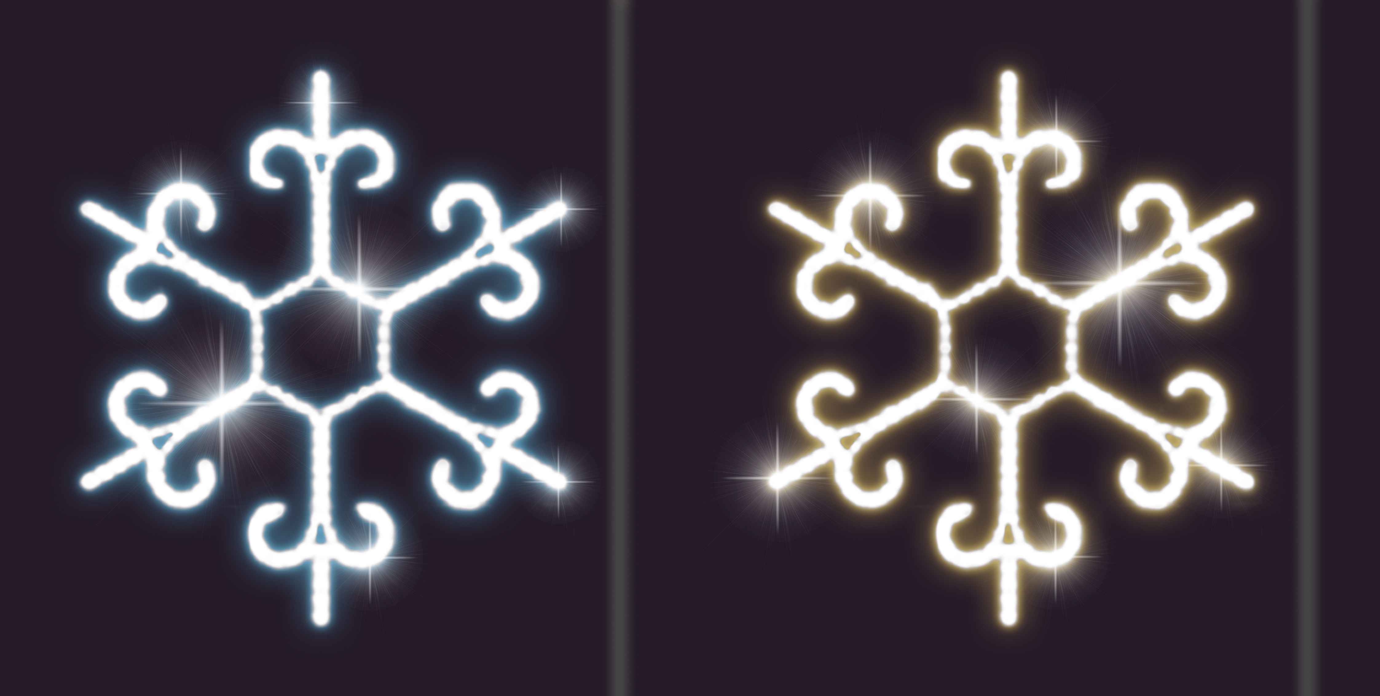 Фигура выполнена в формате плоской 2D конструкции и светится равномерно по всей поверхности. Светодиоды дают яркое, но мягкое свечение, подчёркивающее форму снежинки и её симметрию. Это делает мотив визуально выразительным даже в дневное время и особенно — в вечерней подсветке.