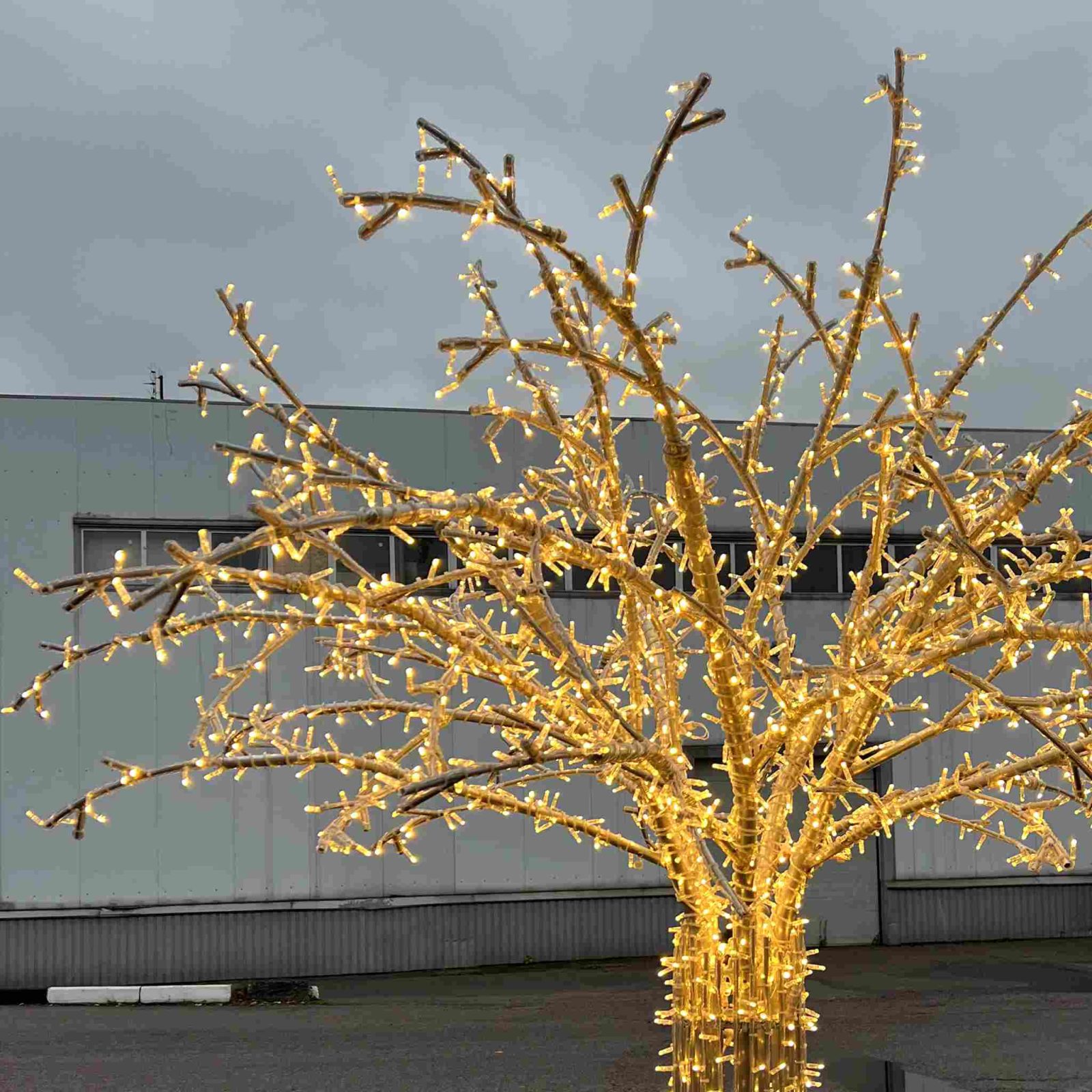 Фигура отлично смотрится как отдельно стоящий арт-объект, так и в составе световых композиций. Диаметр кроны — 2,5 метра, что делает дерево заметным с любого расстояния. Благодаря тёпло-белому свечению, фигура создаёт мягкое, уютное освещение без резких бликов — особенно актуально в вечерние и ночные часы.