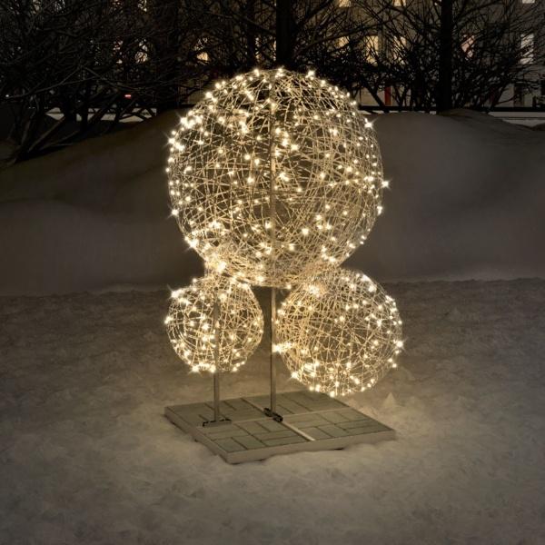 Светодиодные шары из ровинга NB 474 — эффектная инсталляция из трёх фигур разных размеров на общем основании. Идеальны для оформления улиц, входных зон, парков и ТЦ. Прочный каркас, IP65, круглогодичная эксплуатация. Свет — тёплый или холодный. Готовое решение для городского и праздничного декора. Монтаж под ключ от JOYLED.