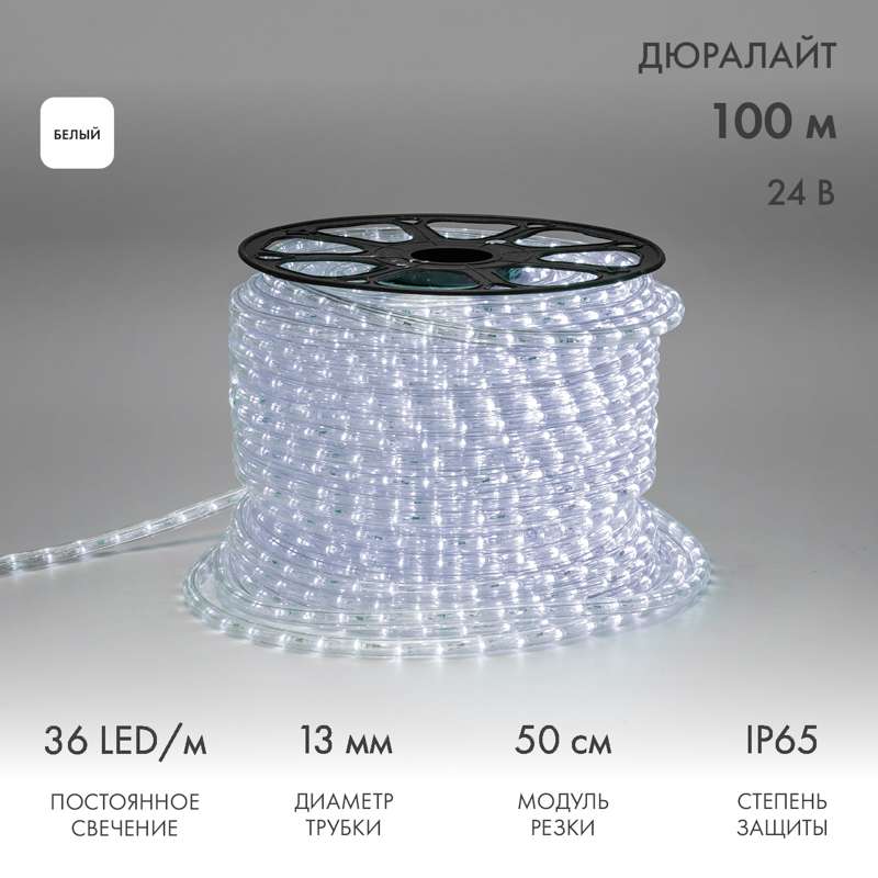 Светодиодный Дюралайт Ø13 мм, двухжильный, БЕЛЫЙ, 24В, 36 LED/м, постоянное свечение, модуль 0,5м, Бухта 100м