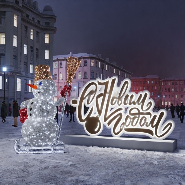 Светодиодная композиция JOYLED: снеговик на санях и надпись «С Новым годом» — яркое решение для оформления улиц, парков и ТРЦ. Высота более 2 м делает её эффектным акцентом. Холодное свечение подчёркивает зимнюю атмосферу, а алюминиевый каркас и защита IP65 гарантируют надёжность и срок службы до 50 000 часов. Отлично подходит для фотозон и праздничных мероприятий. Возможен монтаж под ключ.