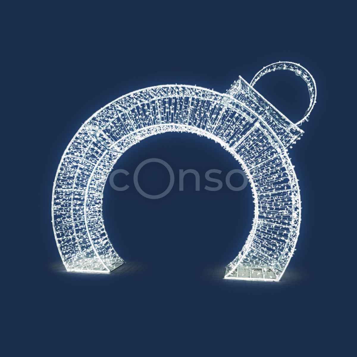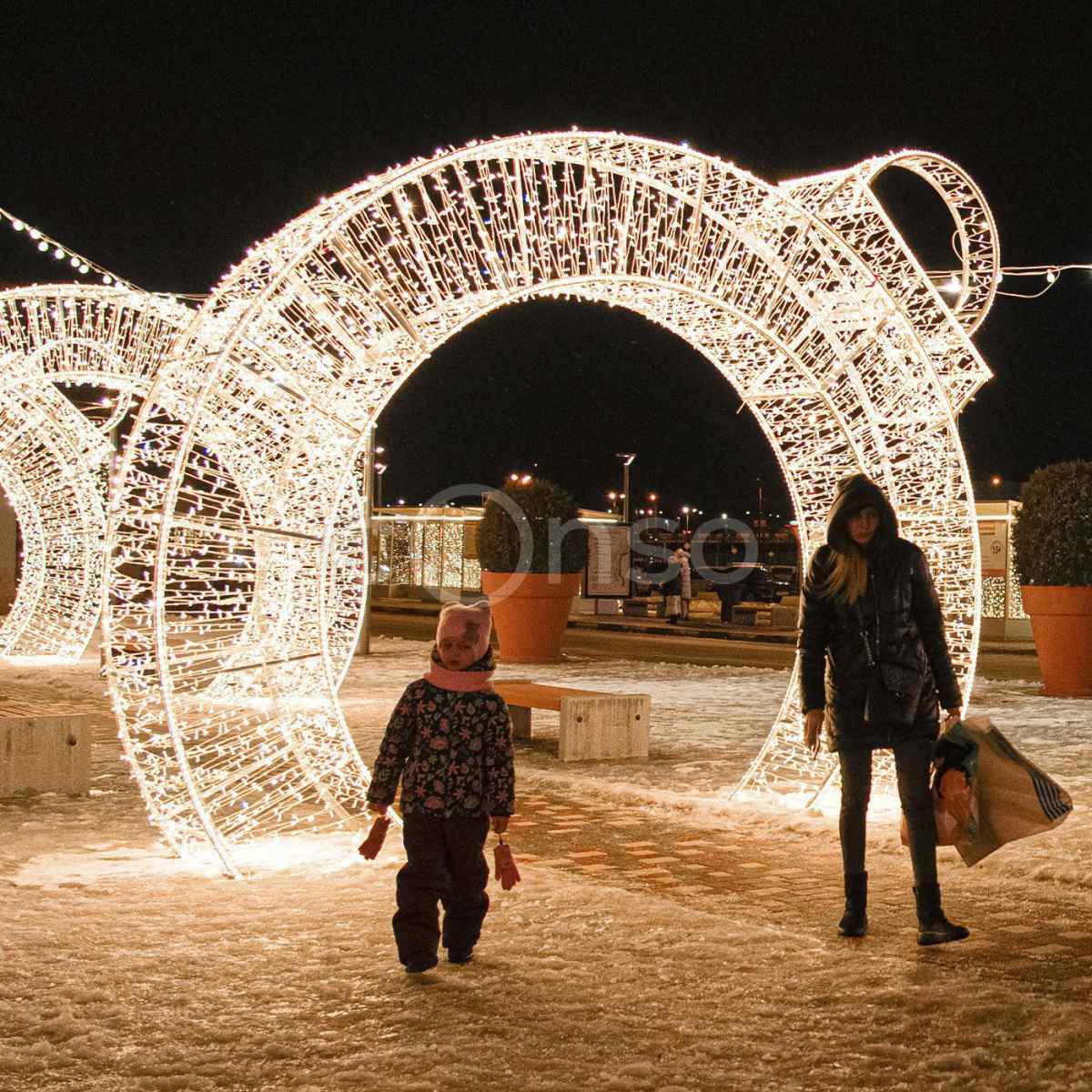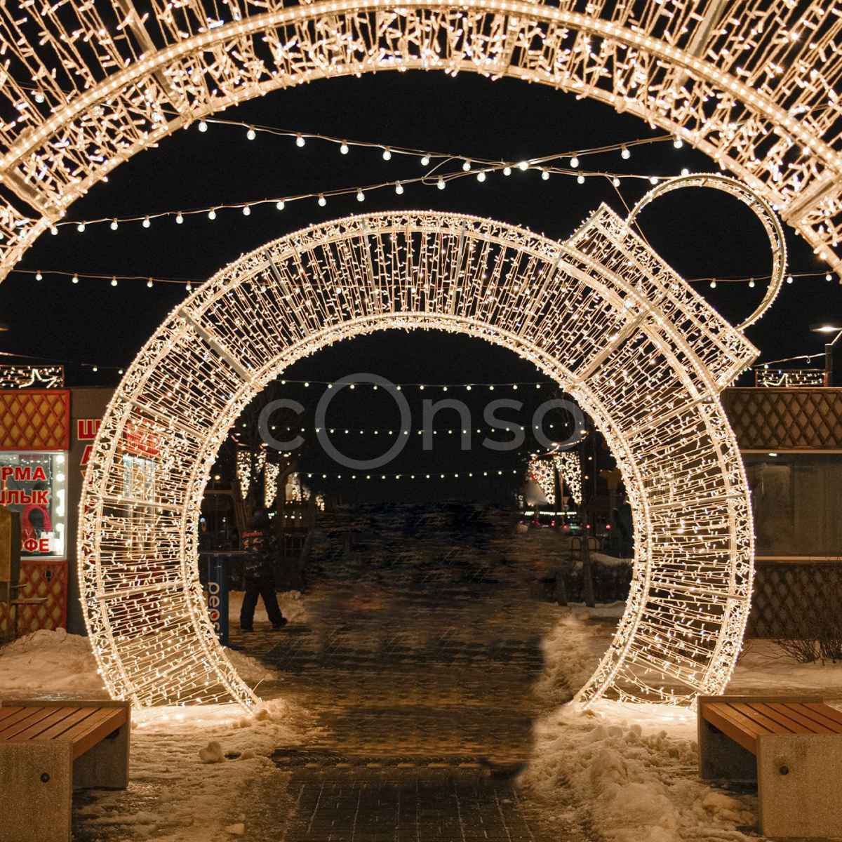 Арка «Кольцо» — эффектный световой элемент для уличного оформления. Размер — 4,5×3,5×0,7 м. Мерцающее холодное свечение, каркас из алюминия, IP65. Подходит для фотозон, входных групп, праздничного оформления ТЦ, улиц, площадей. Устойчива, безопасна, готова к монтажу.