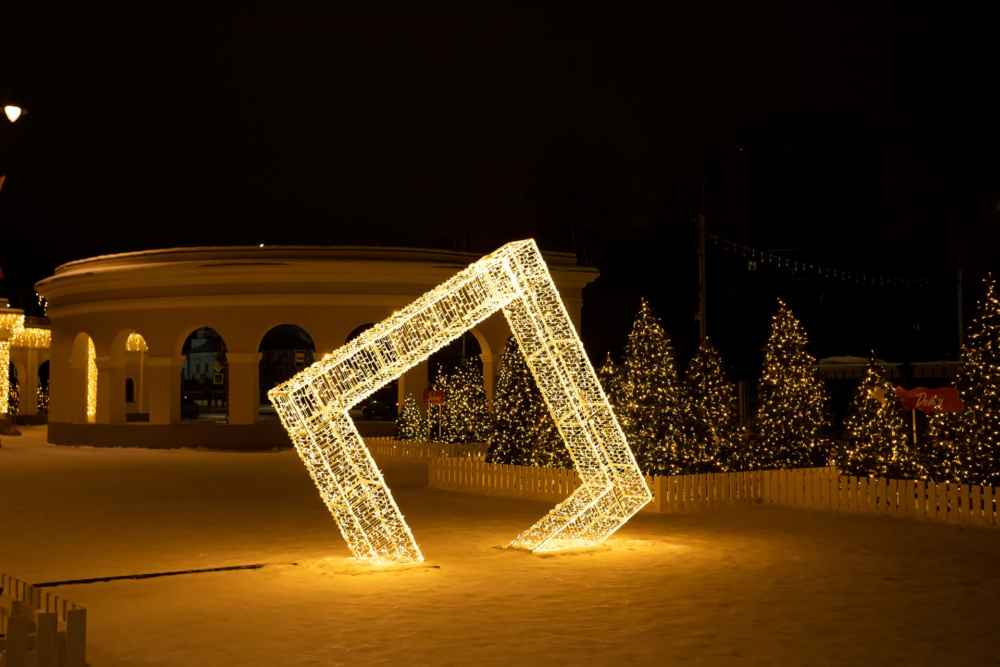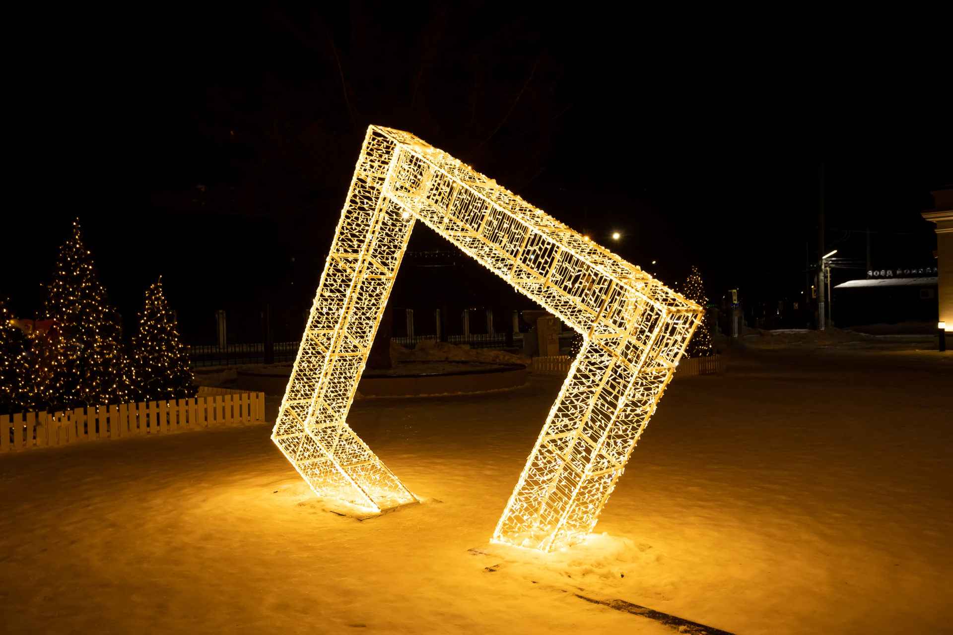 Тёплый свет делает атмосферу уютной, а сама арка становится символом праздника, объединяющим пространство.