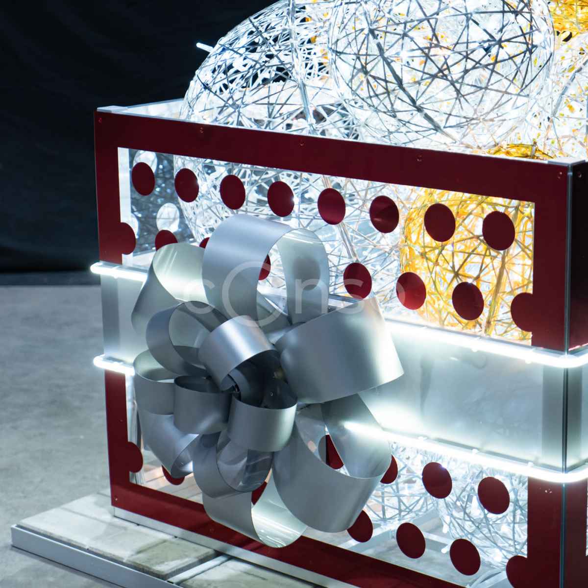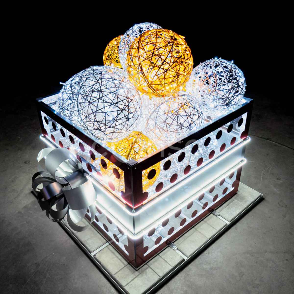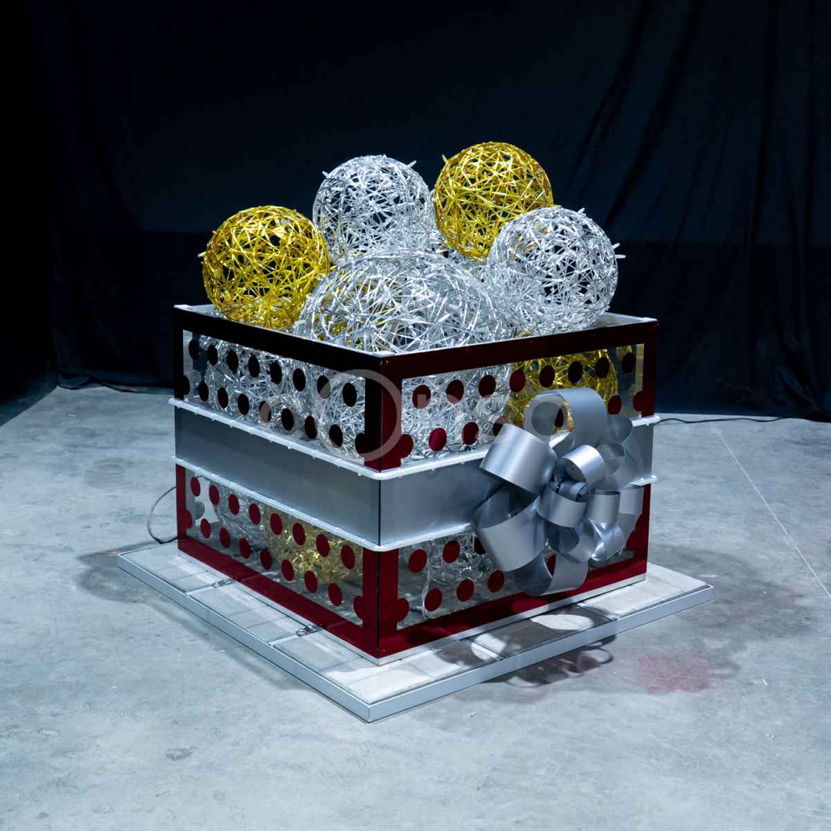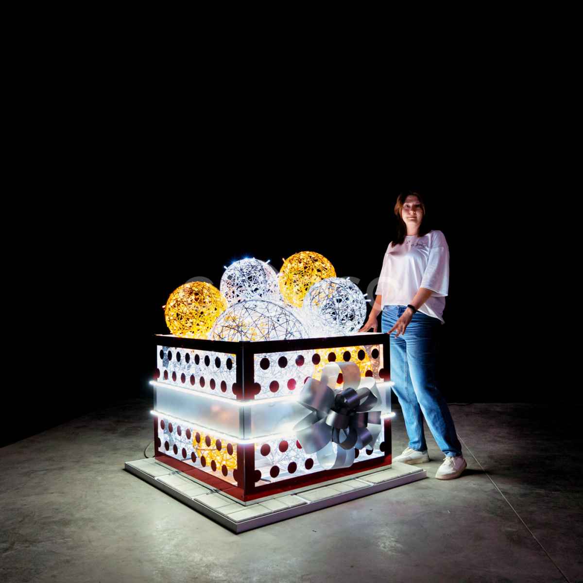 Световая декорация «Набор ёлочных игрушек» — эффектная 3D-каркасная фигура серии OPTIMA-PRO. Размер 1,27×1,32×1,46 м, тёплое свечение, каркас из металла. Светодиоды с ресурсом 50 000 часов, степень защиты IP65. В комплекте плитки пригруза 400×400×40 мм. Идеальна для уличного украшения ТЦ, БЦ, парков и корпоративных мероприятий.