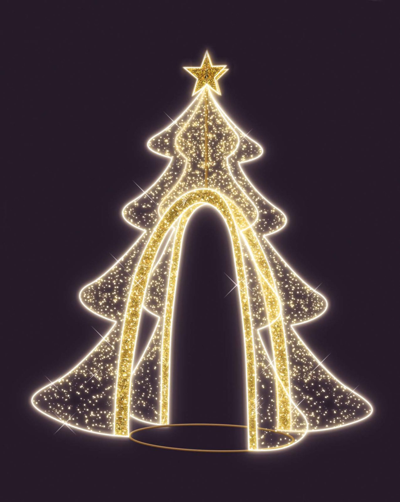 Ёлка смотрится солидно даже в одиночном размещении. Но особенно эффектна она в составе световой композиции — например, вместе с фигурами оленей, подарков, арками и фотозонами. Такое оформление моментально преображает пространство и создаёт тёплую атмосферу новогоднего праздника.