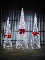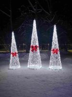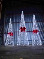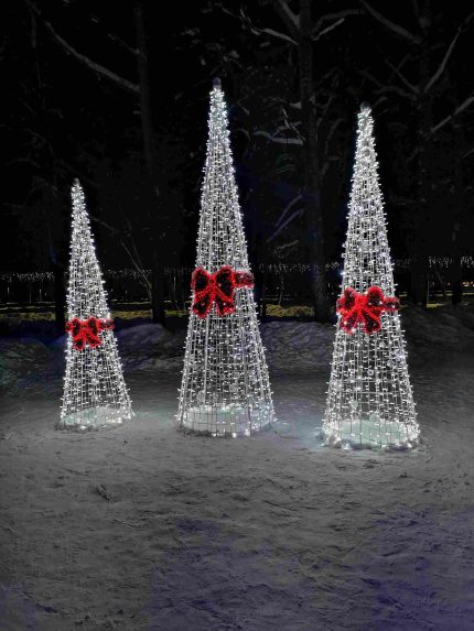 Объёмная световая ёлка с элегантным бантом — универсальное украшение для улиц, парков, ТЦ и загородных участков. Фигура светится холодным белым цветом, выдерживает мороз до −50 °C и полностью готова к круглогодичной эксплуатации. Каркас выполнен из стали с антикоррозийным покрытием. Устанавливается на любых плоских поверхностях. Доступна в других размерах от 2 до 5 метров.