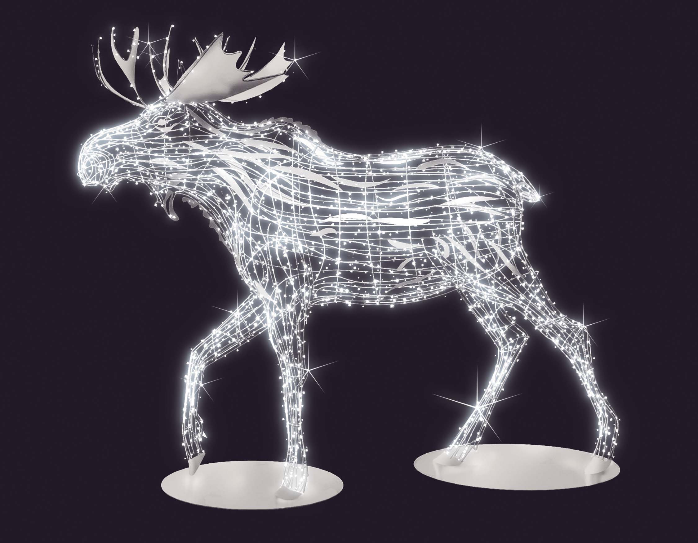 Светящийся лось высотой 3 метра мгновенно привлекает внимание и становится центром композиции. Он подходит как для новогодних мероприятий, так и для круглогодичного оформления общественных пространств, где требуется создать атмосферу уюта, праздника и эмоциональной вовлечённости.