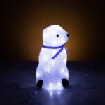 Корпус фигуры выполнен из прозрачного акрилового материала — устойчивого к атмосферным воздействиям, морозам и УФ-воздействию. Акрил не мутнеет со временем и сохраняет чистоту линий. Внутри акрилового объёма размещён LED-модуль с холодным белым свечением, который равномерно освещает весь силуэт, исключая тёмные участки.