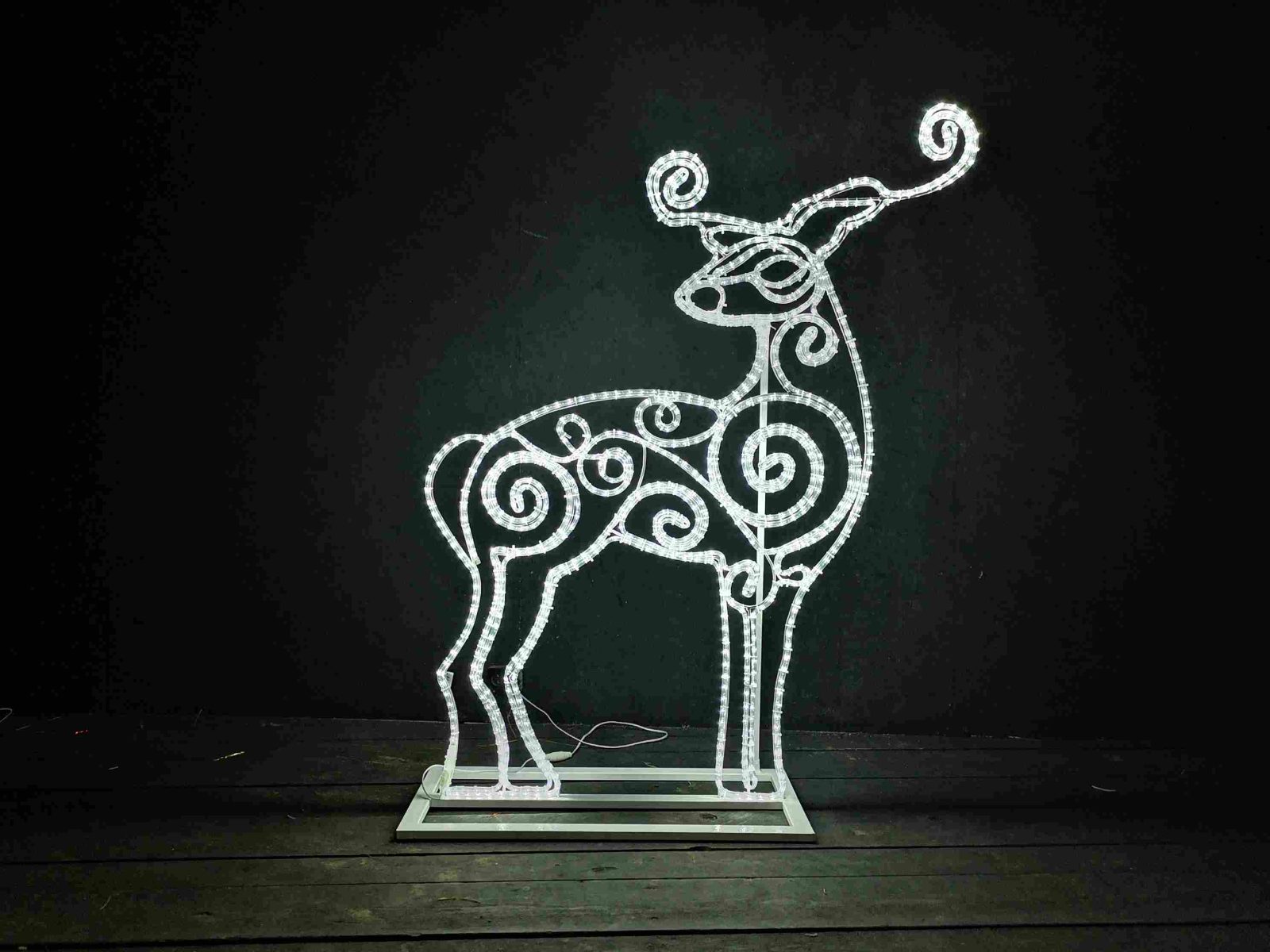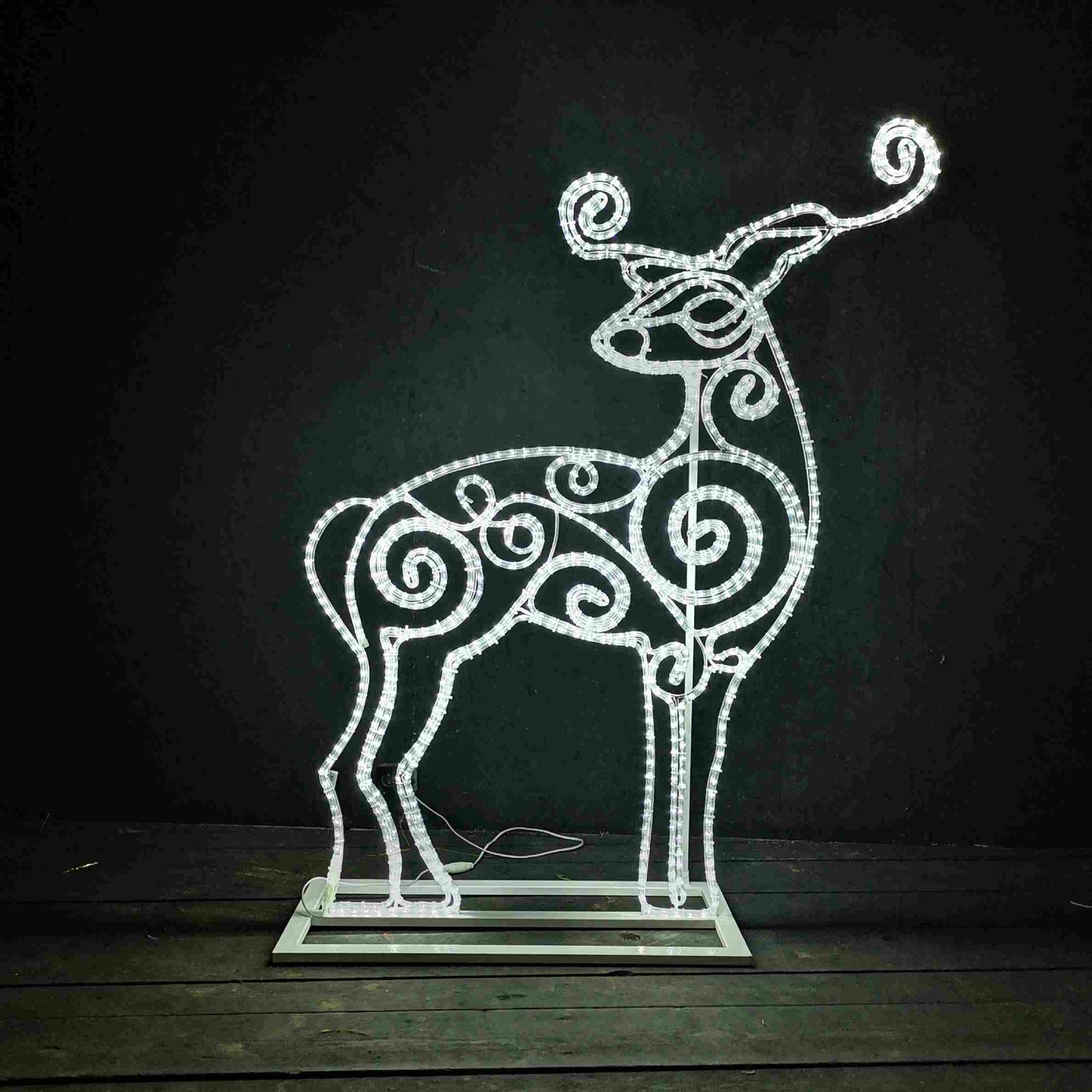 Плоская световая фигура «Олень ажурный» высотой 1,6 м — декоративный элемент для уличного и фасадного оформления. Ажурный каркас из стали с антикоррозийным покрытием, степень защиты IP54. Подключение 220 В. Цвет свечения — по выбору. Подходит для улиц, ТЦ, фотозон и частных территорий.