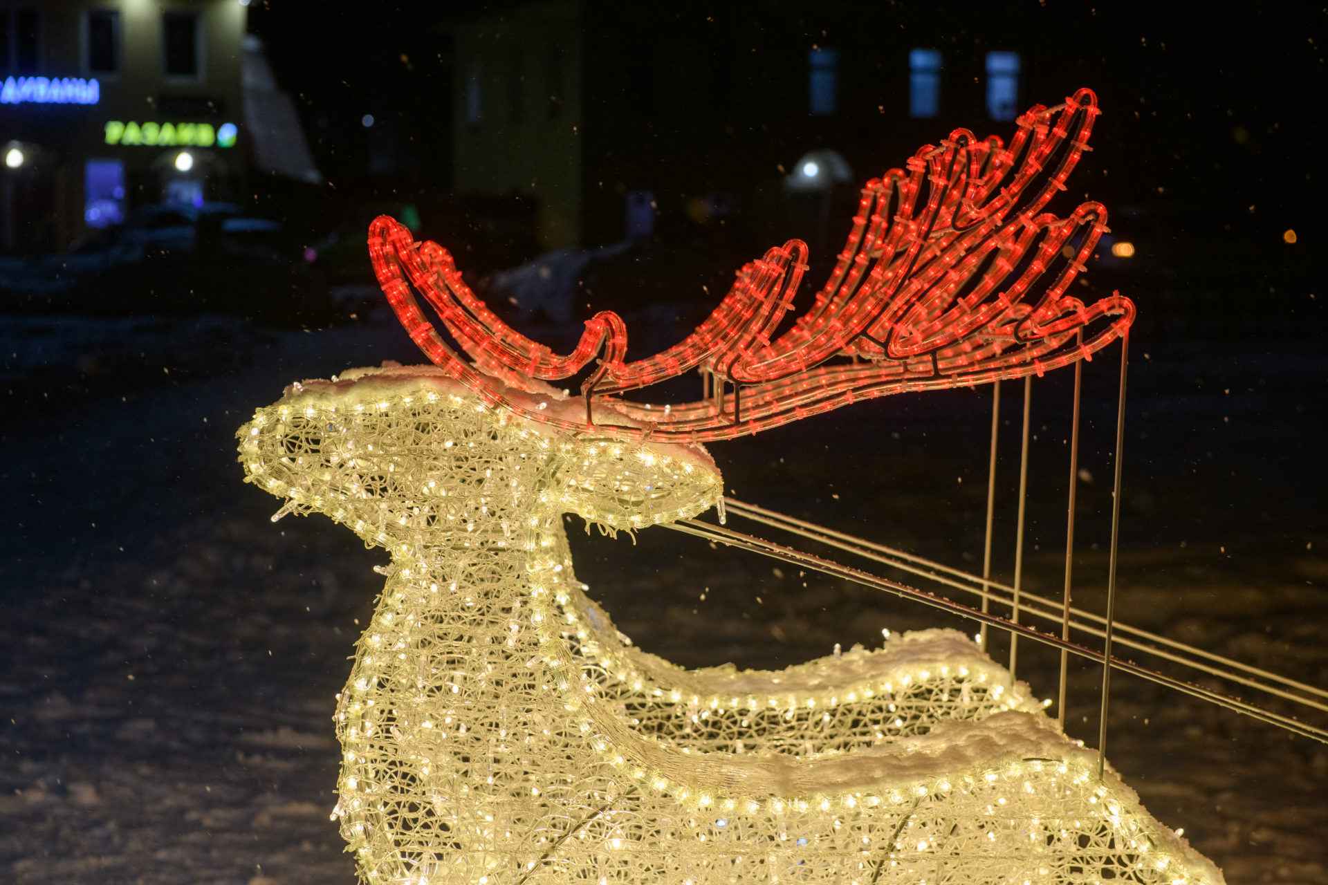 Композиция состоит из изящных оленей и элегантных саней, выполненных в едином стиле. Тёплое свечение создаёт уютную атмосферу и ассоциируется с классическим образом Рождества и Нового года.