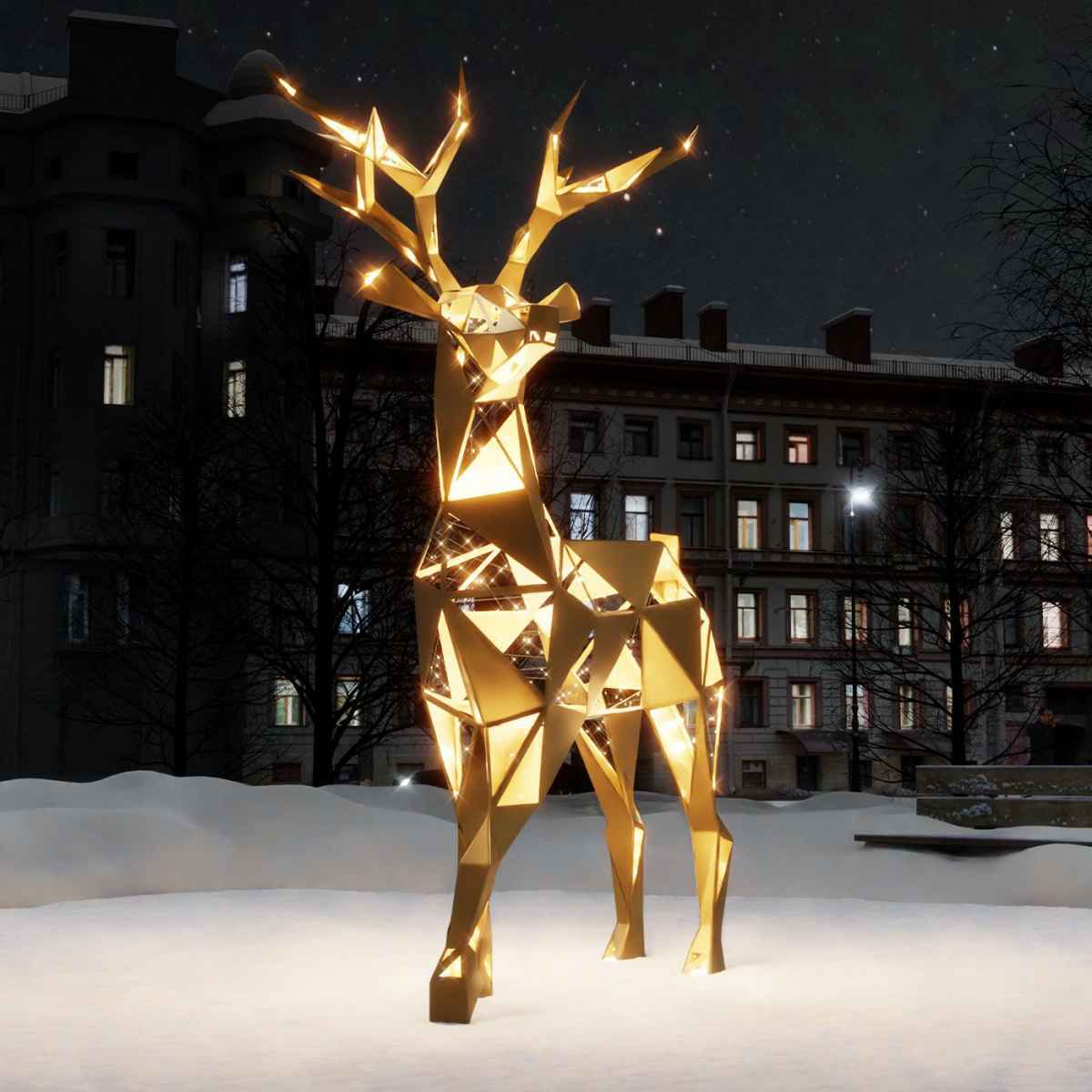 Световая полигональная фигура «Золотой олень» — это эффектный и современный акцент для уличного новогоднего оформления. Высокая, массивная, геометрически выверенная фигура моментально привлекает внимание и вызывает ассоциации с зимними праздниками, лесом и символами Рождества.