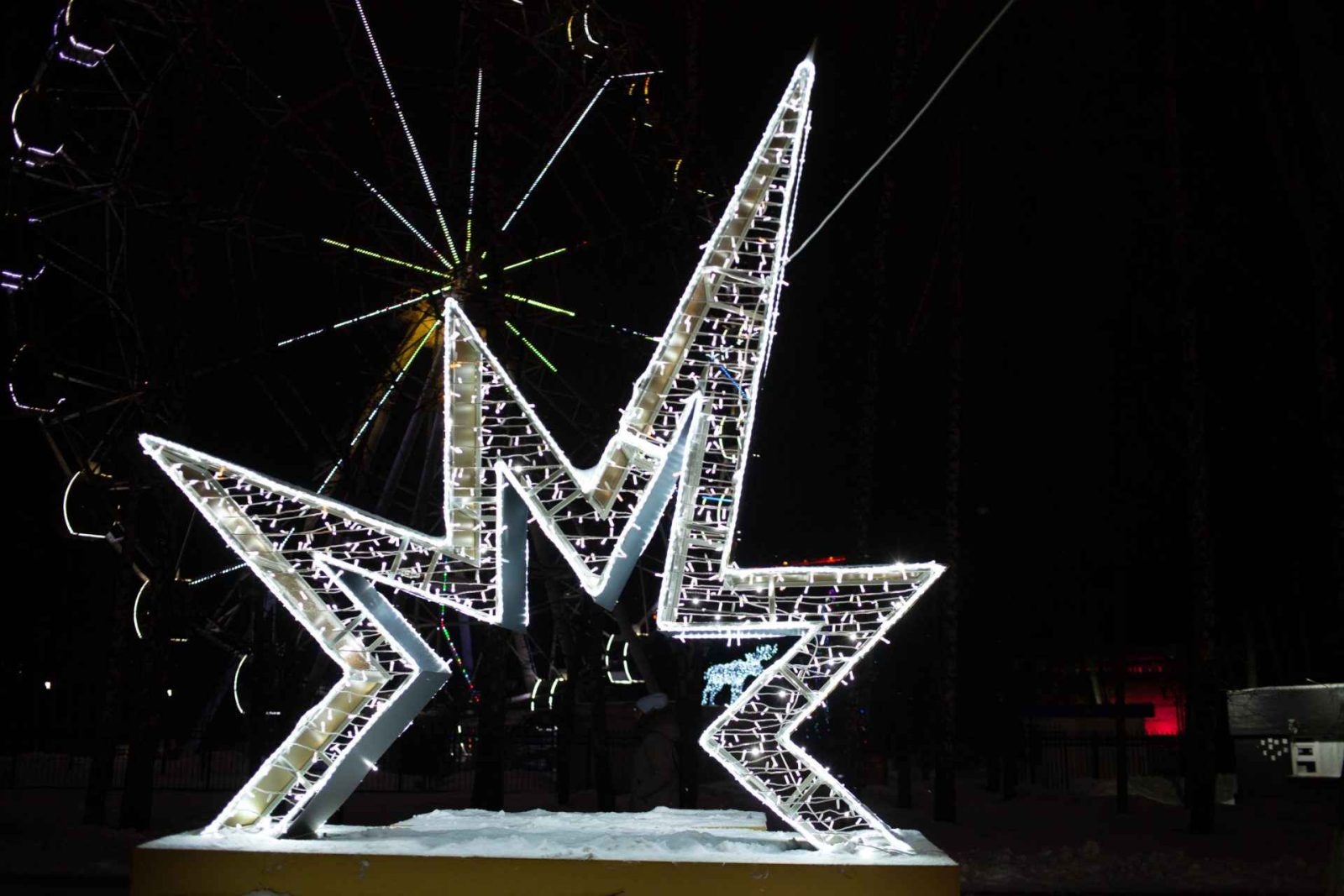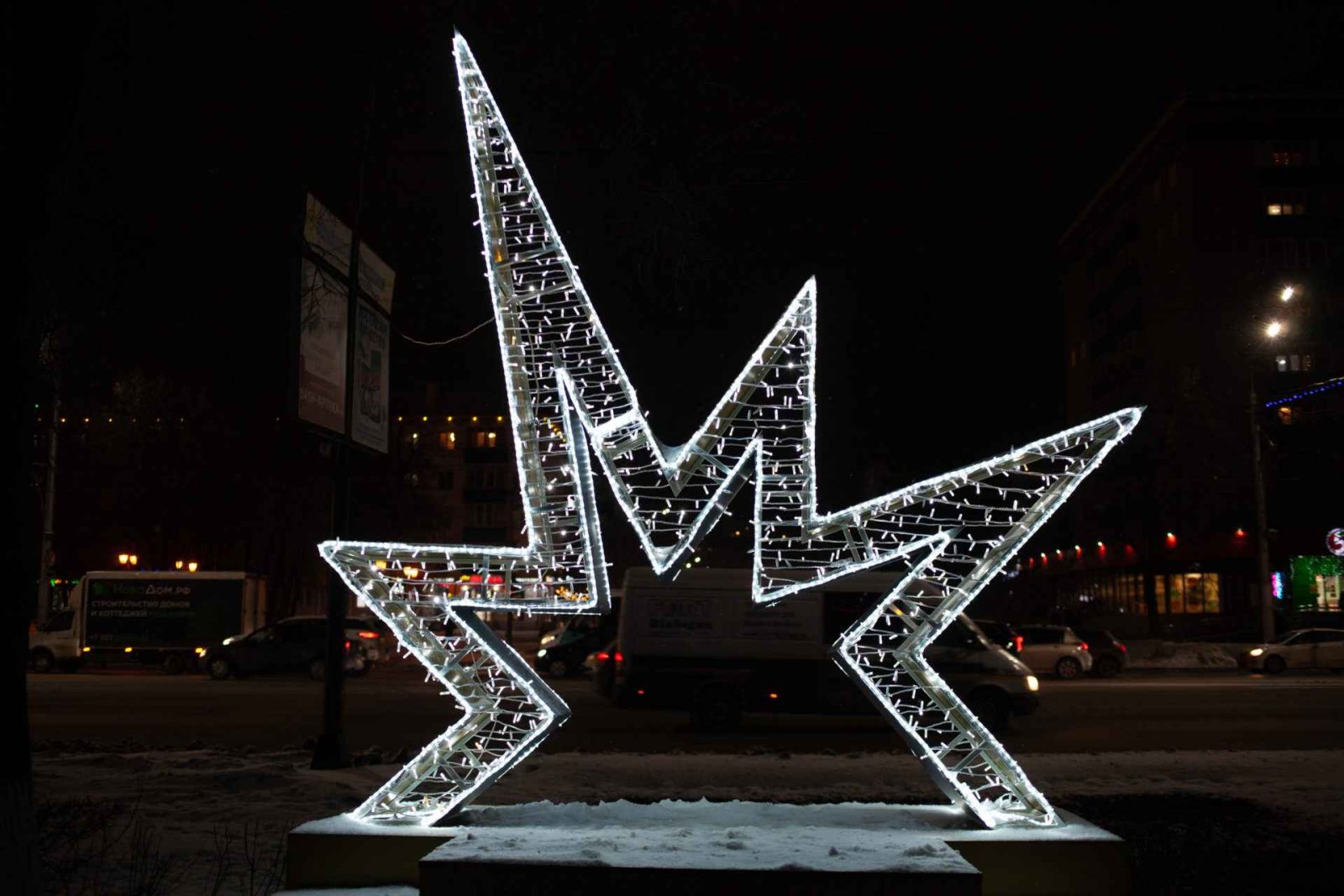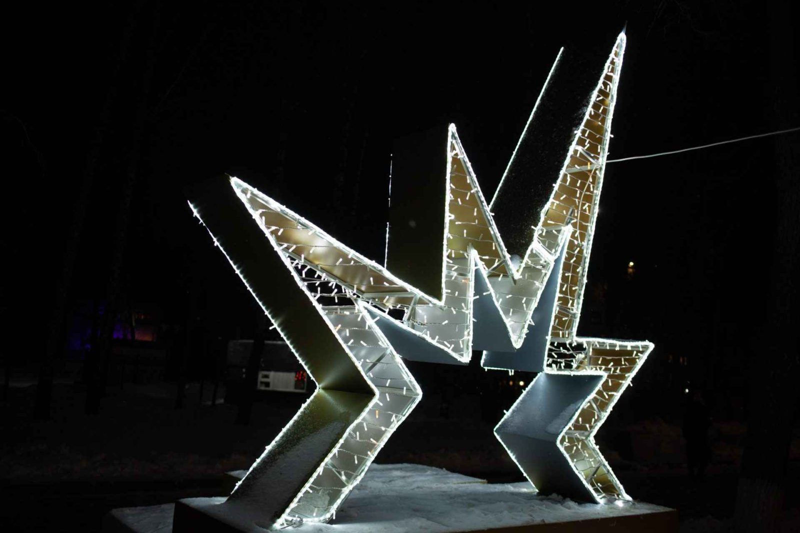 Размер фотозоны — 3×3 м. Холодное белое свечение создаёт чистую, элегантную и праздничную атмосферу. Высокая детализация каркаса и чёткая геометрия делают фотозону уместной в любом окружении: от парка или сквера до фуд-корта или торговой галереи.