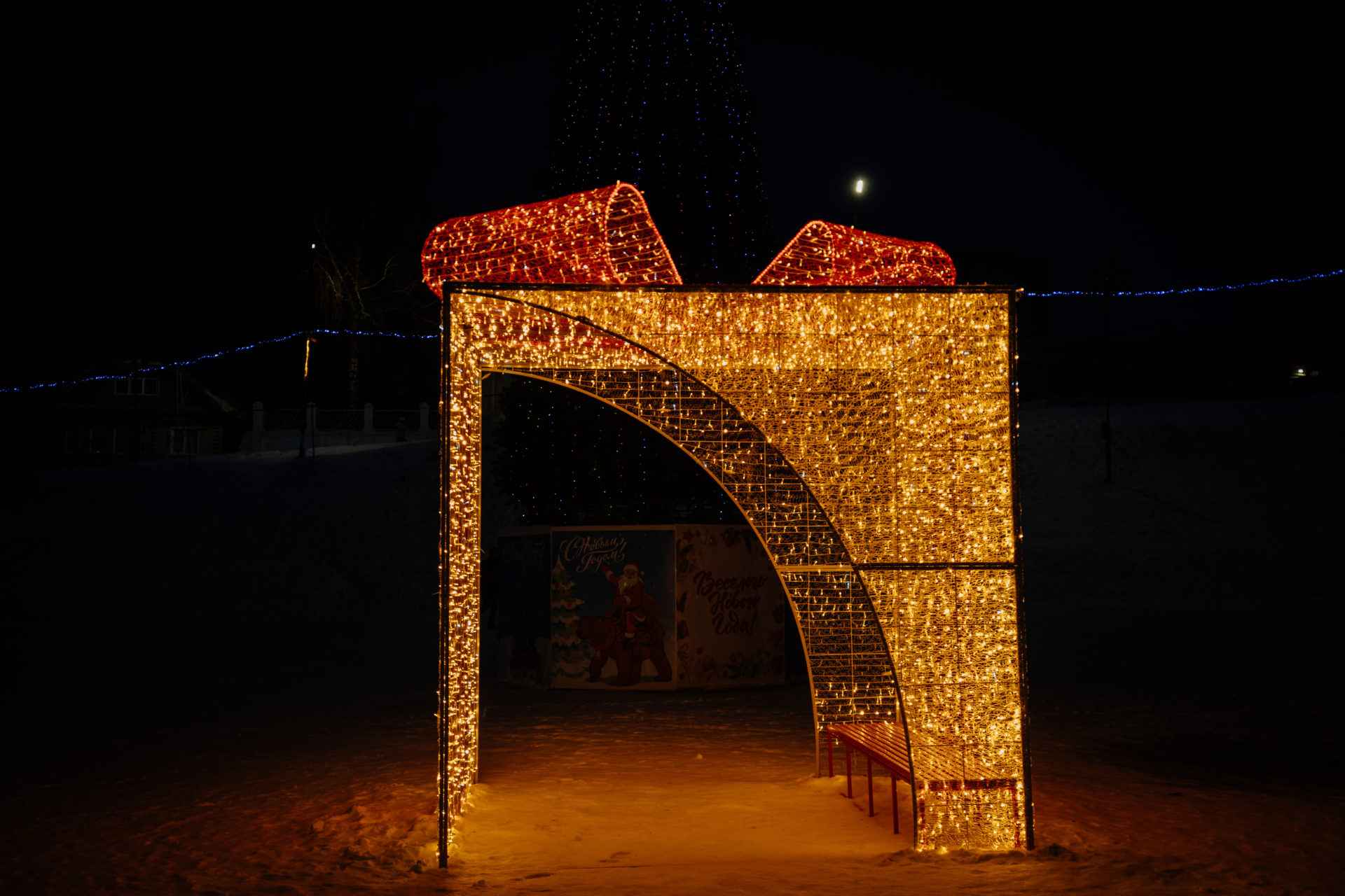 Тёплое свечение придаёт конструкции праздничный и одновременно уютный вид. Форма подарочной коробки ассоциируется с радостью, ожиданием и торжеством, что делает фотозону универсальной для разных мероприятий.