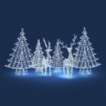 Световая композиция «Олени в лесу» создаёт атмосферу настоящего зимнего леса прямо в городской среде. Два оленя с динамикой и четыре ёлки разных размеров формируют гармоничный ансамбль, который сразу привлекает внимание посетителей. Такой декор подходит для улиц, парков, центральных площадей, входных зон торговых центров и бизнес-центров, а также для корпоративных праздников и тематических фотозон.
