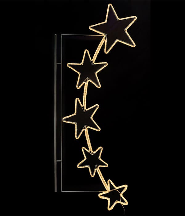 Модель выполнена в форме пяти звёзд, соединённых дугообразной линией. Тёплый белый свет подчёркивает торжественность и уют, создаёт атмосферу праздника без излишней навязчивости. Конструкция выглядит современно и аккуратно, легко интегрируется в любое архитектурное пространство.