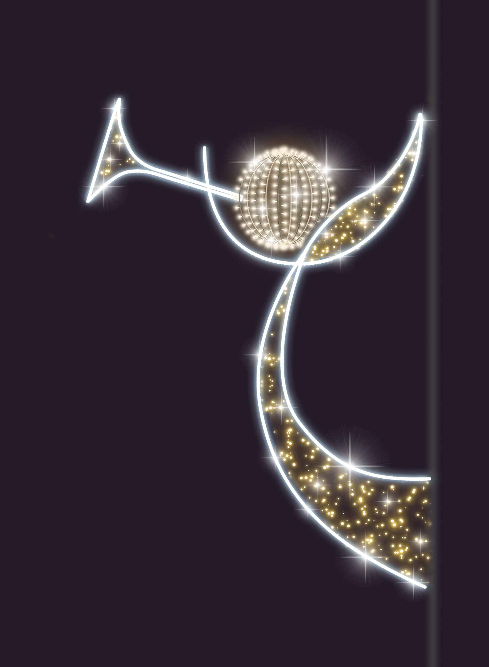 Световая консоль СК-108 — это декоративный элемент с чёткой геометрией и премиальной цветовой палитрой. Благодаря сочетанию золотого и серебряного свечения, фигура выделяется даже на фоне яркой архитектурной подсветки. Она подчёркивает структуру улиц, фасадов и входных групп, придаёт пространству праздничное настроение и визуальную завершённость.
