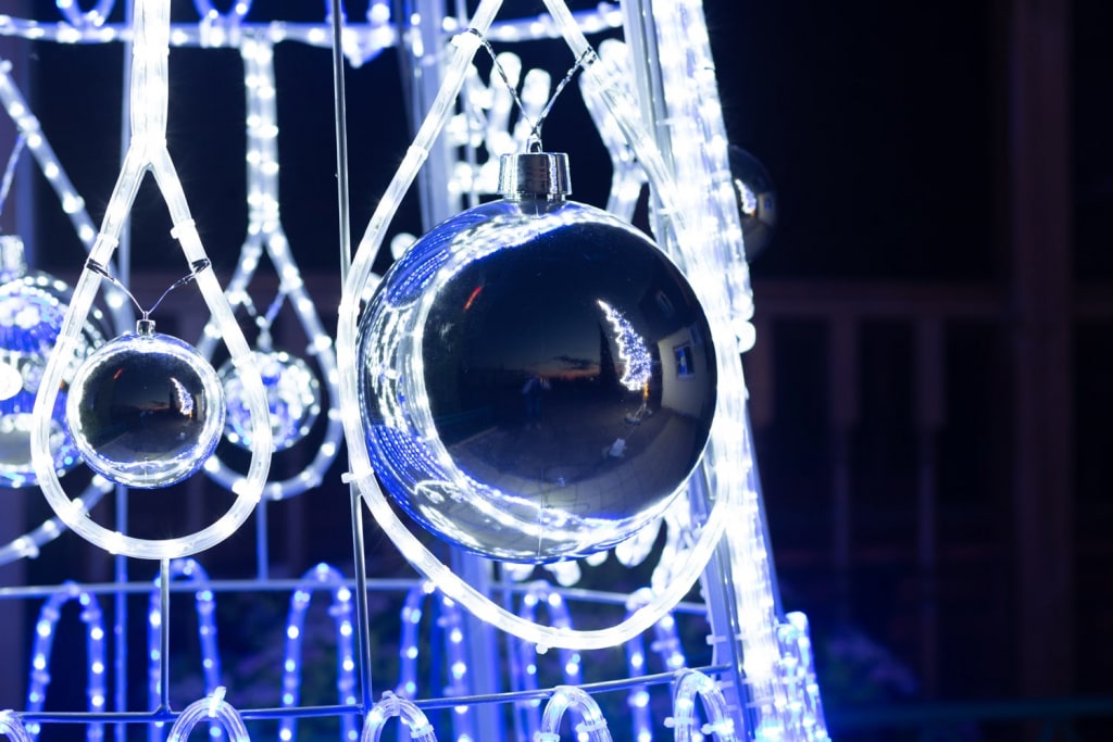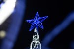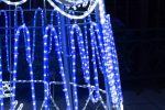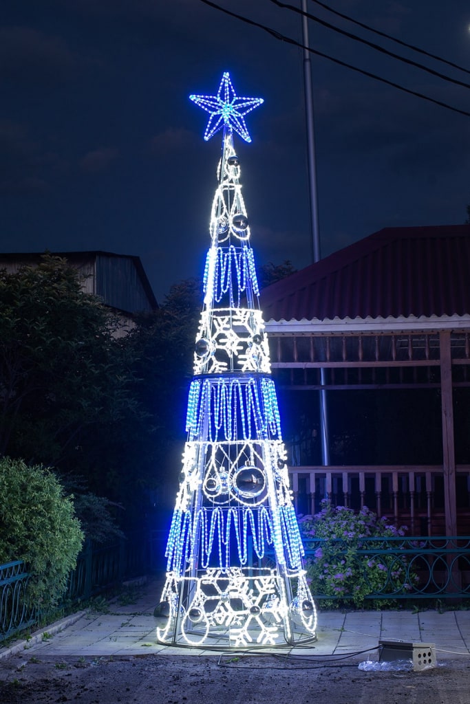 Конструкция доступна в бело-синем свечении — классическом зимнем сочетании, которое подчёркивает атмосферу морозного праздника. Такой цветовой сценарий выглядит чисто, свежо и универсально: он гармонирует с фасадами, елками, гирляндами и световыми фигурами любой палитры.