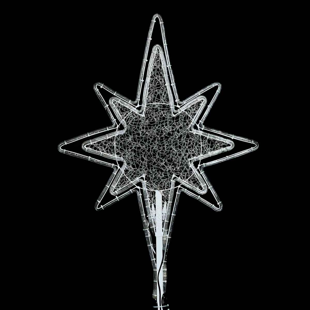 Форма звезды считывается мгновенно, без пояснений. Это универсальный и праздничный символ, понятный каждому. Эффект мерцания придаёт макушке динамику и визуальное «дыхание», особенно заметное в вечернее и ночное время.