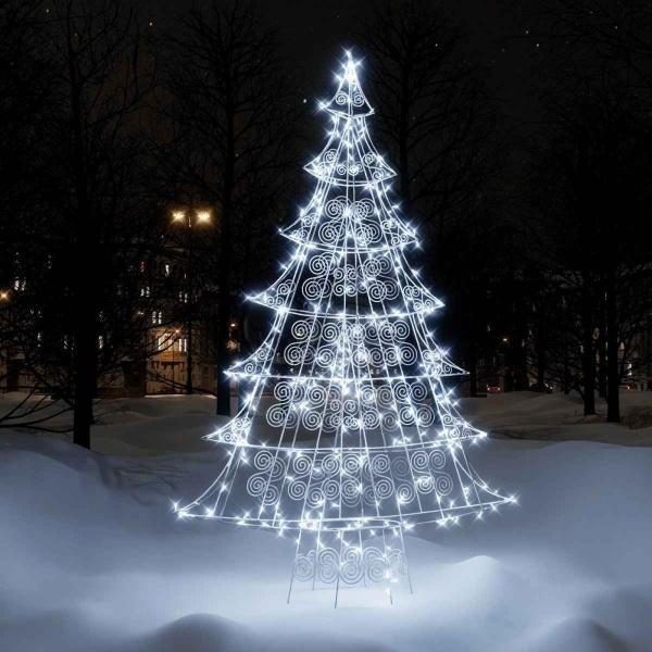 Сияющая, ярко оформленная фигура елочки часто служит элементом декора для входов в различные коммерческие заведения, такие как торговые центры, рестораны, кафе и магазины, способствуя привлечению клиентов. Эти изделия изготавливаются из окрашенной стальной проволоки.